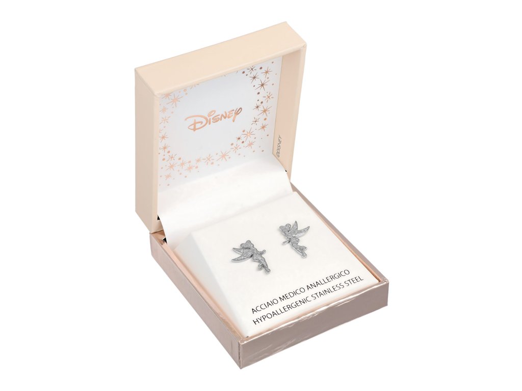 Náušnice s postavou víly Zvonilky od Disney jsou vyrobeny z nerezové oceli. Dekorovány jsou blyštivou glazurou, která tyto náušnice činí neobyčejnými. Náušnice se zapínají na klasickou puzetku, která zajišťuje pohodlné nošení a zabraňuje jejich ztrátě. Tyto dětské náušnice jsou dodávány ve stylové krabičce.