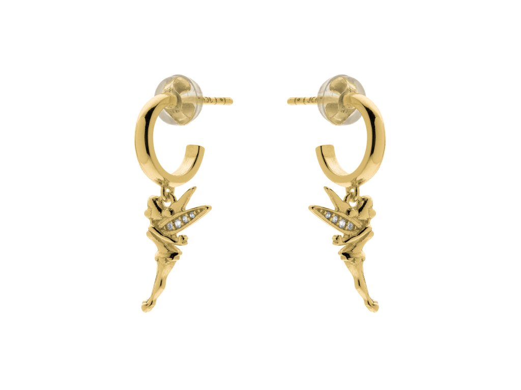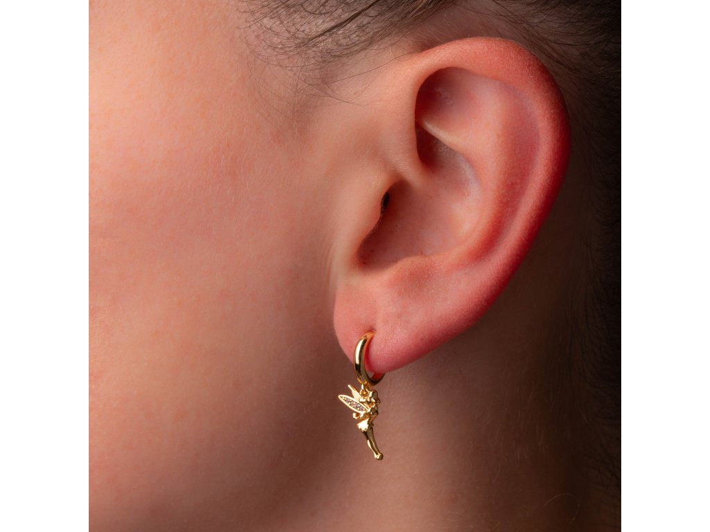 Náušnicím kruhového tvaru dominuje přívěšek s oblíbenou postavou víly Zvonilky od Disney. Šperk je vyroben z velmi kvalitního pozlaceného stříbra ryzosti 925 s lesklou povrchovou úpravou. Dekorován je čirými krystaly na křídle víly. Zirkony tak dodávají šperku ten správný třpyt. Náušnice se zapínají na klasickou puzetku, která zajišťuje pohodlné nošení a zabraňuje jejich ztrátě. Tyto dětské náušnice jsou dodávány ve stylové krabičce. Váha šperku je 1,9 g.
