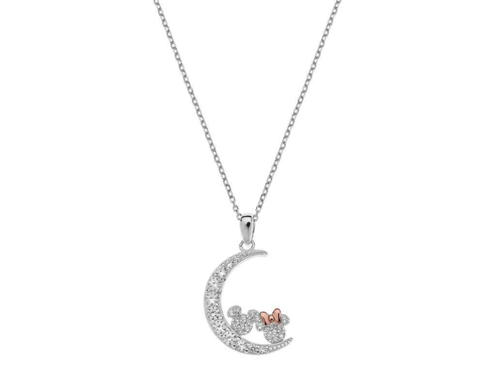 Náhrdelník s přívěskem ve tvaru měsíce s postavičkami Mickey a Minnie Mouse od Disney je vyroben z velmi kvalitního stříbra ryzosti 925 s lesklou povrchovou úpravou. Na náhrdelníku zcela vyniká mašle myšky Minnie, která je pozlacena do tónu růžového zlata. Čiré krystaly poté zdobí celý přívěsek a dodávají mu tak neodolatelný šmrnc. Maximální délka náhrdelníku je 40 cm. Dodáván je ve stylové krabičce. Váha šperku je 4,3 g.