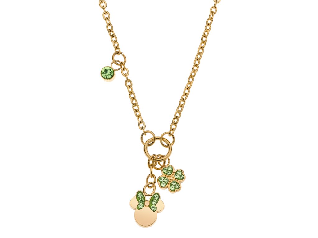 Náhrdelník je vyroben z kvalitní nerezové oceli, která je pozlacena, a zdoben je přívěsky ve tvaru Minnie Mouse a čtyřlístku.Oslnivý lesk šperku dodávají světle zelené krystaly.