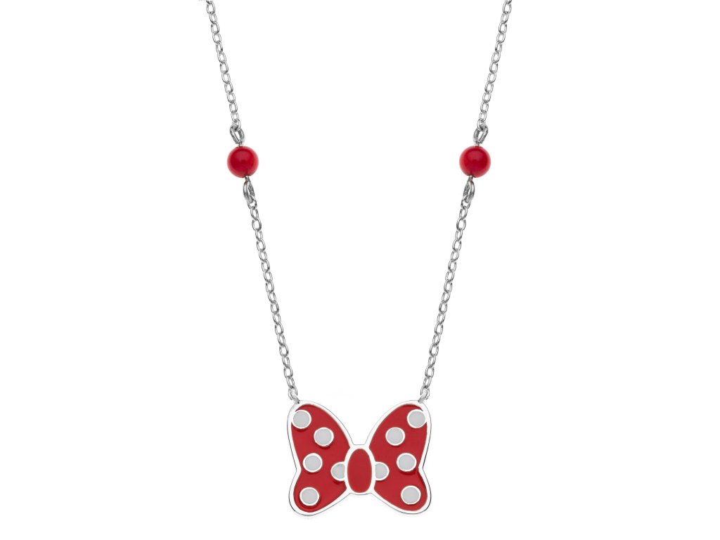 Stříbrný dětský náhrdelník s červenými korálky a ozdobou ve tvaru mašle Minnie Mouse potěší všechny malé fanoušky ikonické disneyovské postavičky. Červený smalt zvýrazňuje charakteristickou mašli a dokonale ladí s výraznými korálky.