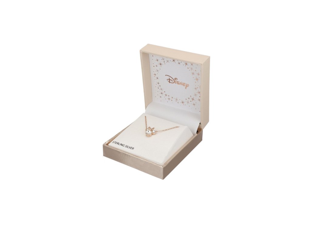 Náhrdelník s přívěskem ve tvaru hlavy myšky Minnie Mouse od Disney je vyroben z velmi kvalitního stříbra ryzosti 925 v tónu růžového zlata s lesklou povrchovou úpravou. Přívěsek Minnie Mouse je zdoben třpytivými krystaly, které šperku dodávají na výjimečnosti. Maximální délka náhrdelníku je 40 cm. Dodáván je ve stylové krabičce. Váha šperku je 5,3 g.