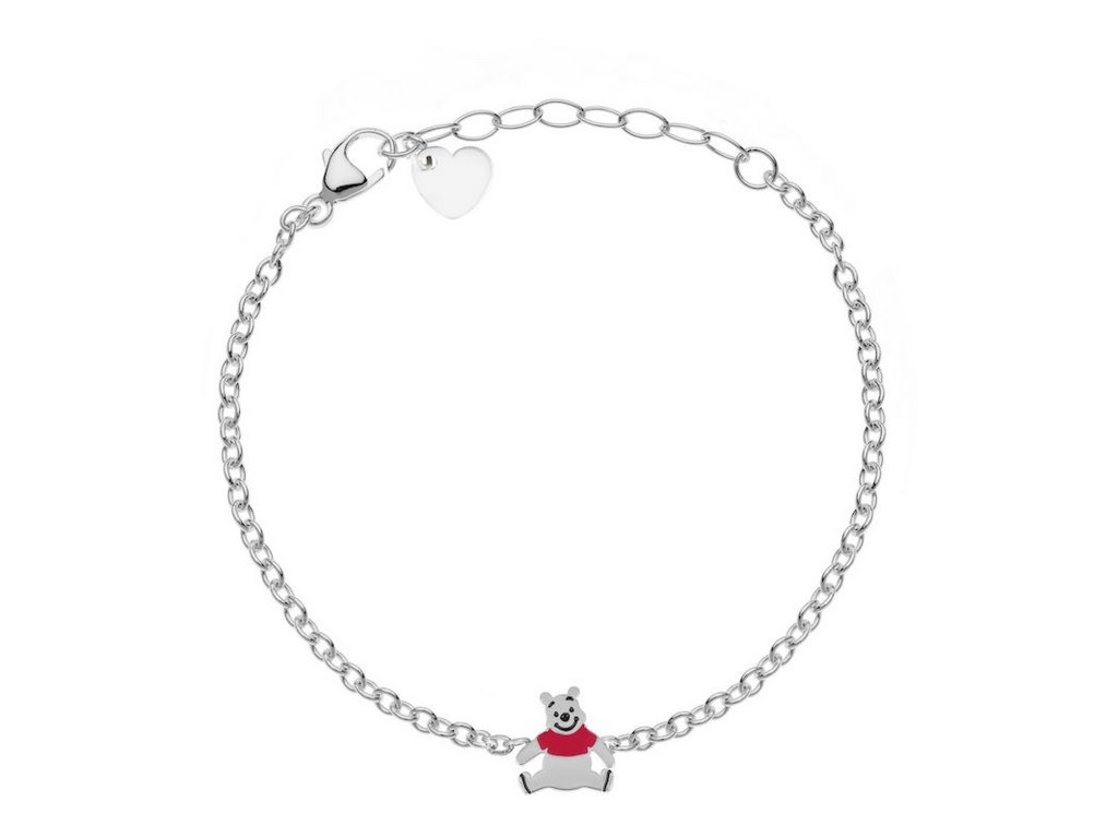 Dětský náramek s ozdobou ve tvaru Medvídka Pú potěší všechny malé milovníky pohádkového světa Disney. Červený smalt zvýrazňuje charakteristické detaily oblíbené postavičky a dodává šperku hravý a veselý vzhled.