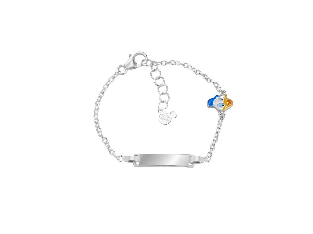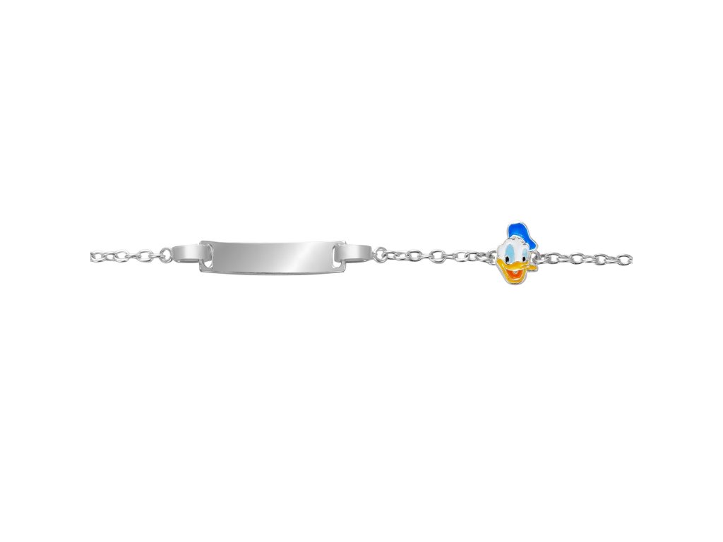 Tento kouzelný náramek je vyroben ze stříbra a zdoben precizně zpracovaným přívěskem veselého kačera Donalda. Barevná kombinace modrého, žlutého a bílého smaltu dokonale vystihuje jeho ikonický vzhled a dodává šperku hravost. Lesklá povrchová úprava zvýrazňuje jemné detaily a činí šperk ještě působivějším.