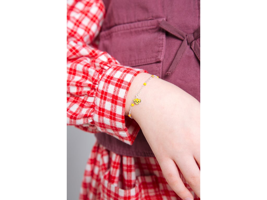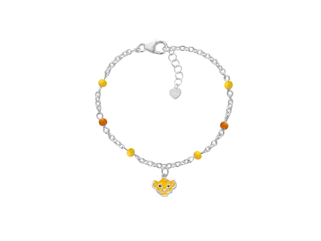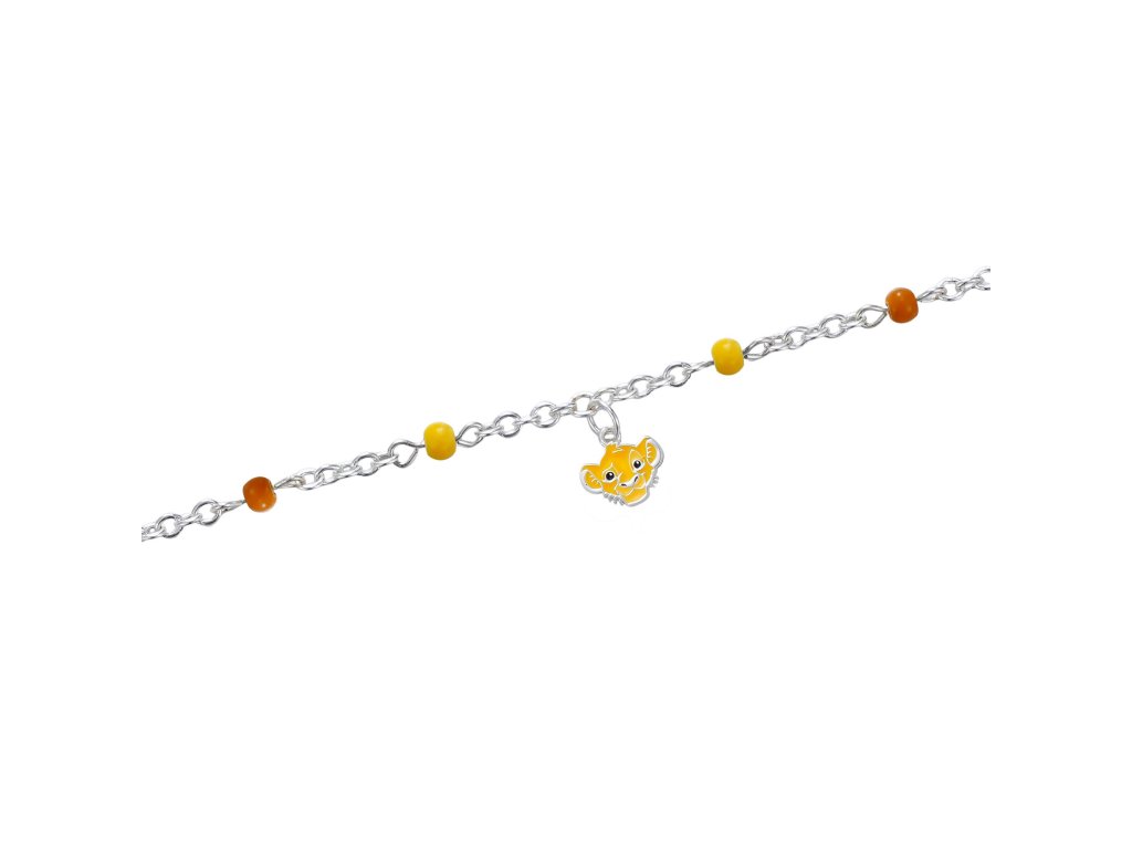 Tento náramek je vyroben z kvalitního stříbra a zdoben je detailně propracovaným přívěskem s motivem oblíbené postavy z filmu Lví král. Žlutý a černý smalt přináší hravý a poutavý vzhled, který zaujme na první pohled. Náramek je doplněn drobnými korálky žluté a oranžové barvy, které dodávají šperku na eleganci a hravosti. Lesklá povrchová úprava zvýrazňuje každý detail a činí náramek ještě atraktivnějším.