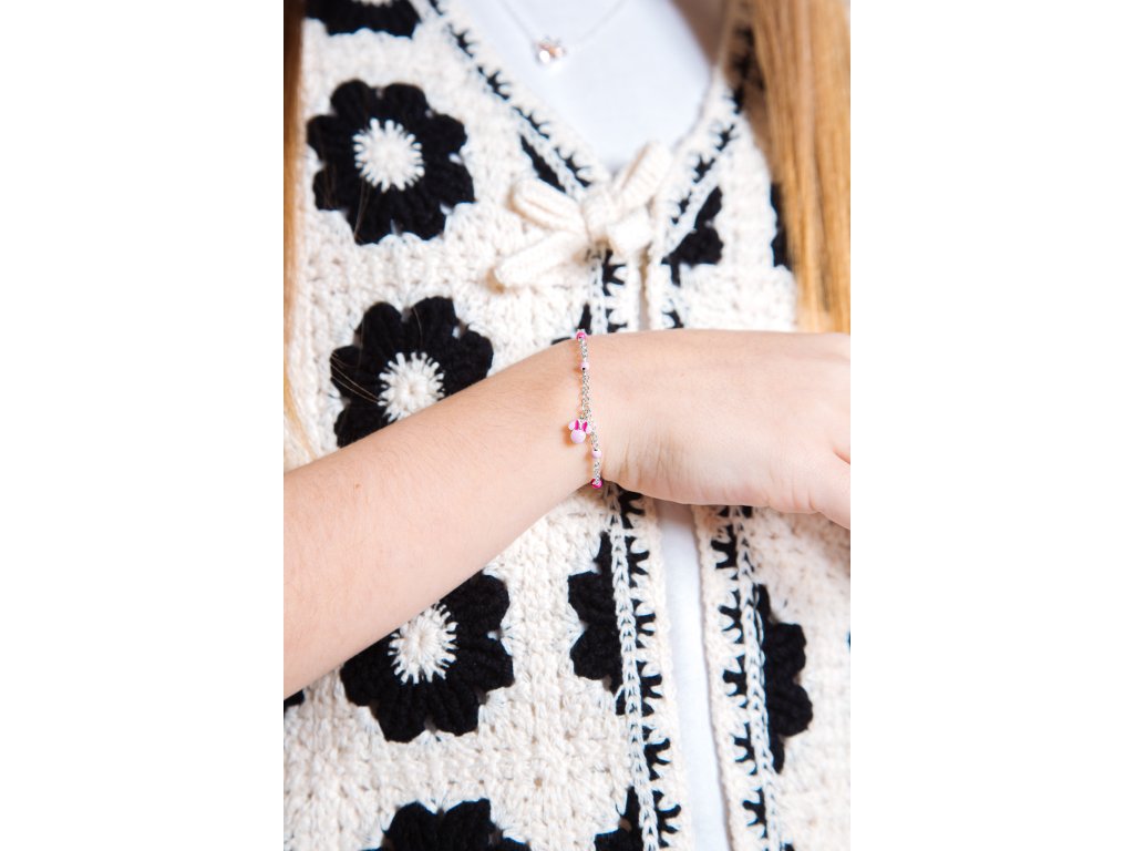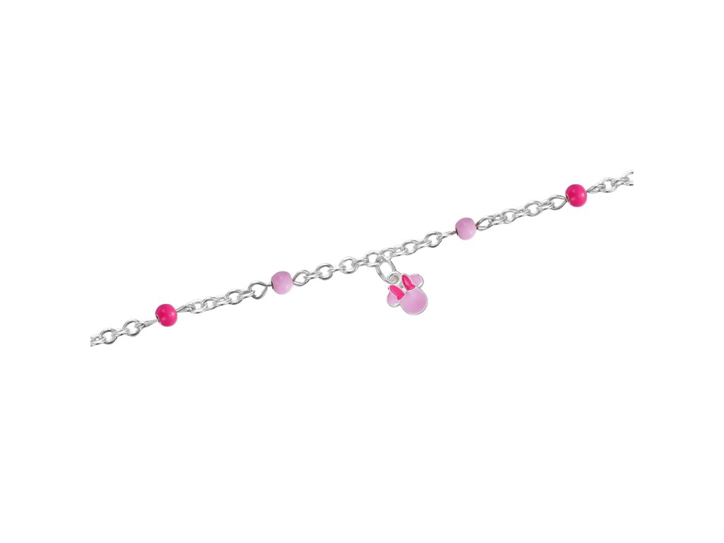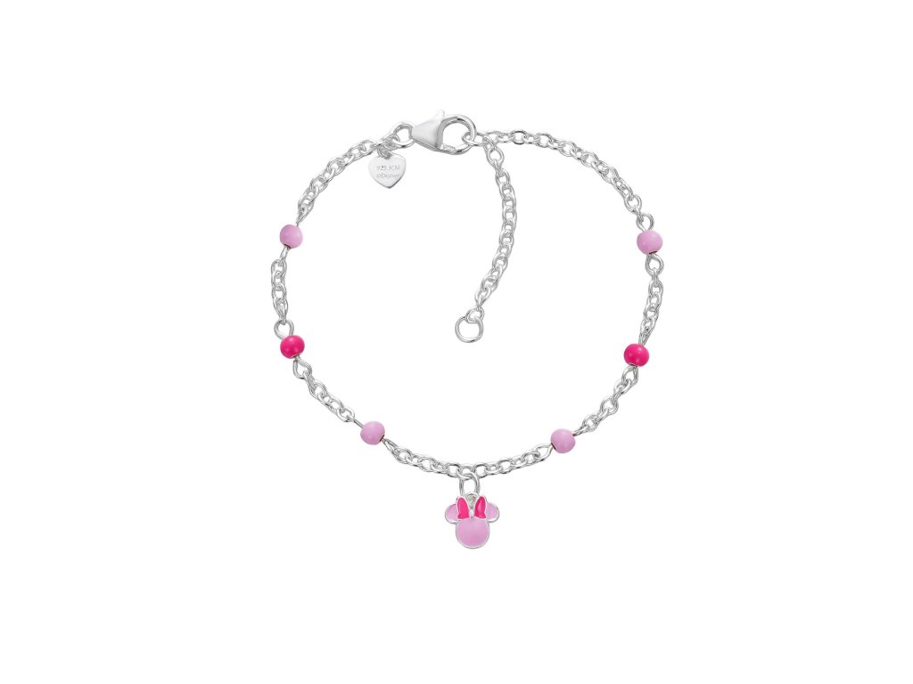 Tento něžný náramek je vyroben ze stříbra. Zdoben je detailně propracovaným přívěskem postavičky Minnie. Precizně nanesený růžový smalt dodává šperku hravost a půvab, který okouzlí každou malou slečnu. Náramek je doplněn drobnými korálky světle růžové a tmavě růžové barvy, které podtrhují elegantní vzhled a dodávají náramku na hravosti. Lesklá povrchová úprava zvýrazňuje detaily a činí šperk ještě atraktivnějším.