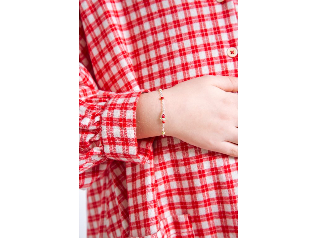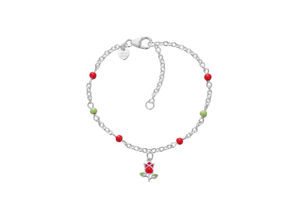 Tento půvabný náramek je vyroben ze stříbra a zdoben detailně propracovaným přívěskem růžičky. Jemně nanesený červený a zelený smalt dodává šperku živost a romantický nádech. Náramek je doplněn drobnými korálky v ladících odstínech, které podtrhují jeho něžný a elegantní vzhled. Lesklá povrchová úprava zvýrazňuje detaily a dodává šperku jemný třpyt.