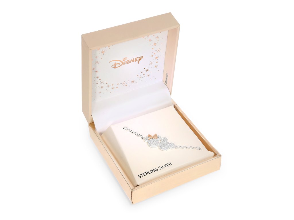 Náramek je vyroben ze stříbra ryzosti 925/1000 a zdobí jej třpytivé čiré krystaly, které mu dodávají nádech noblesy.. Mašle Minnie je navíc pozlacena růžovým zlatem.