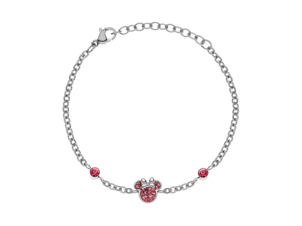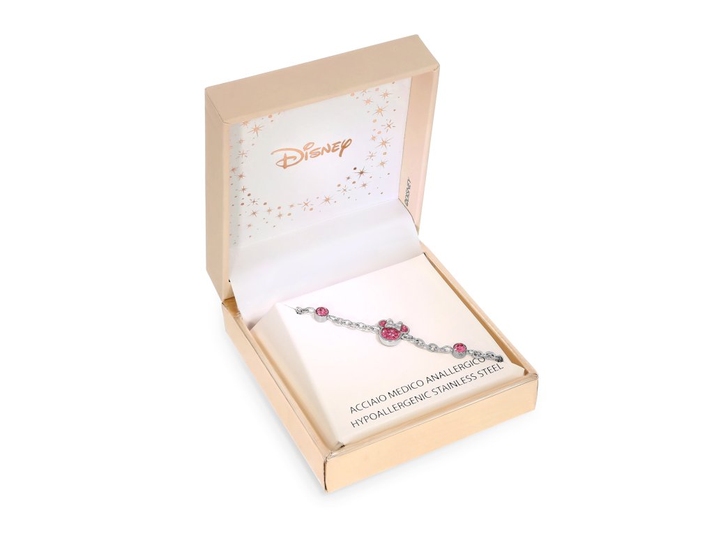 Náramek s ozdobou ve tvaru hlavy postavičky myšky Minnie Mouse od Disney je vyroben z nerezové oceli s lesklou povrchovou úpravou. Hlava myšky Minnie je zdobena fuchsiovými krystaly, které z barvy oceli nádherně vynikají. Zajímavým detailem jsou rovněž dva krystaly fuchsiové barvy, které náramek zdobí a dodávají mu na výjimečnosti. Maximální délka náramku je 17 cm. Dodáván je ve stylové krabičce.