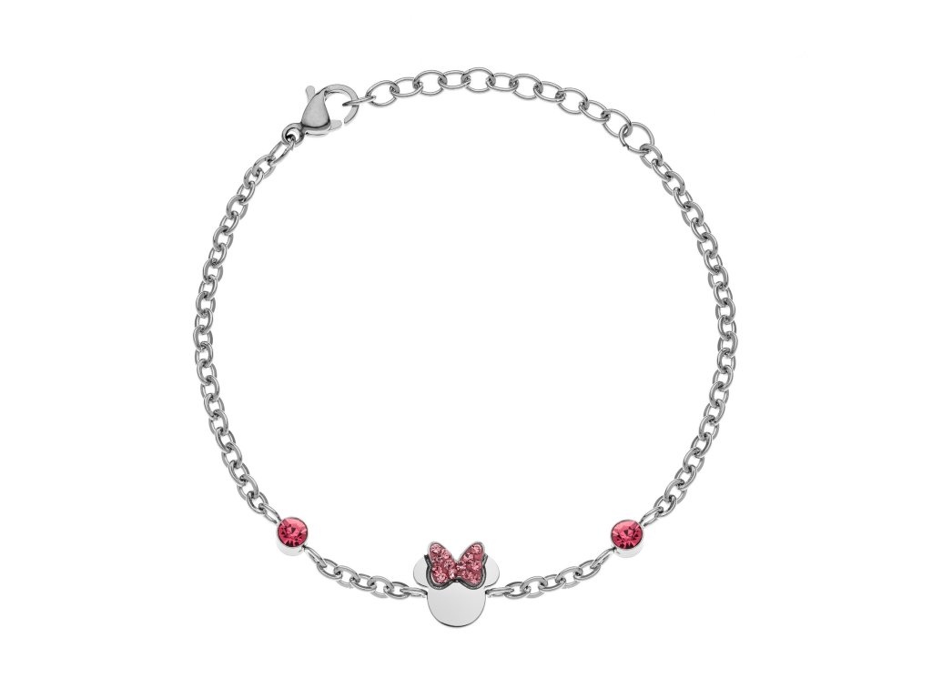 Náramek s ozdobou ve tvaru hlavy postavičky myšky Minnie Mouse od Disney je vyroben z nerezové oceli s lesklou povrchovou úpravou. Mašle myšky Minnie je zdobena růžovými krystaly, které v oceli zcela vynikají. Velmi působivé jsou rovněž dva krystaly stejné barvy, které náramek zdobí. Maximální délka náramku je 17 cm. Dodáván je ve stylové krabičce.