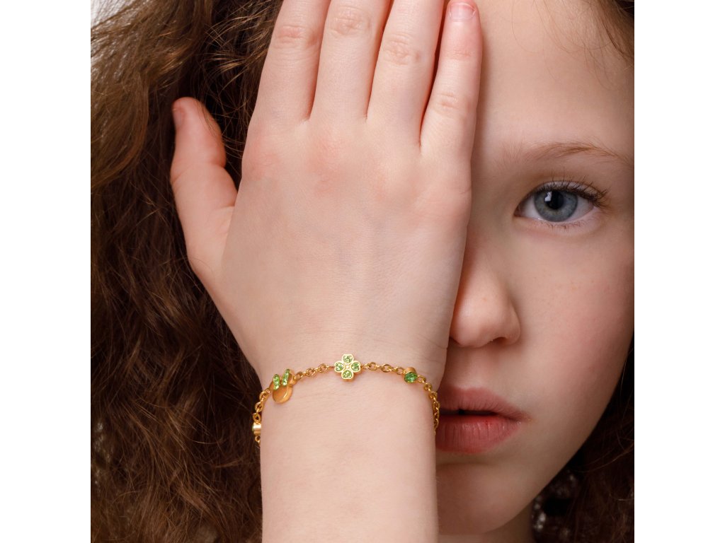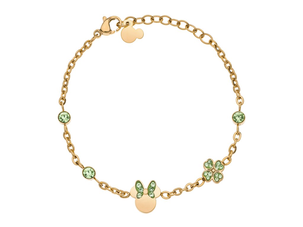 Náramek je vyroben z kvalitní nerezové oceli, která je pozlacena, a zdoben je přívěsky ve tvaru Minnie Mouse, Mickey Mouse a čtyřlístku.Oslnivý lesk šperku dodávají světle zelené krystaly.