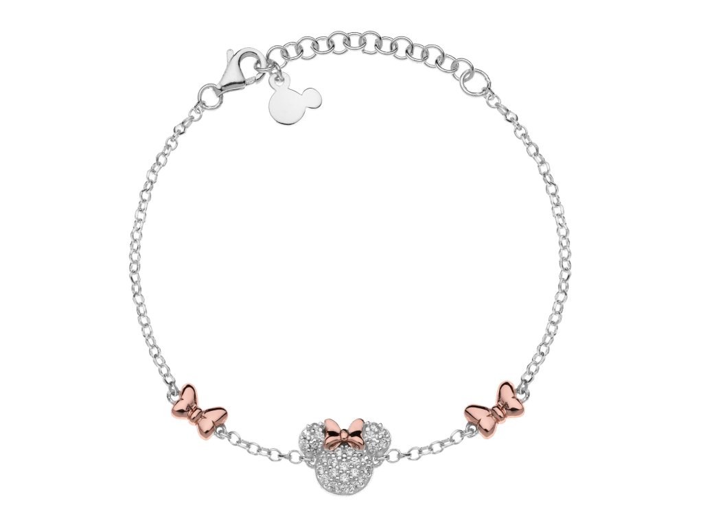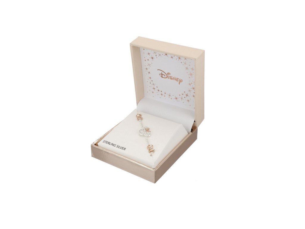Náramek zdobený hlavou postavičky myšky Minnie Mouse od Disney je vyroben z velmi kvalitního stříbra ryzosti 925 s lesklou povrchovou úpravou. Mašle myšky je pozlacena do barvy růžového zlata, stejně jako další dvě mašličky. Hlava myšky Minnie je zdobena čirými krystaly. Maximální délka náramku je 14 cm. Dodáván je ve stylové krabičce. Váha šperku je 3,2 g.