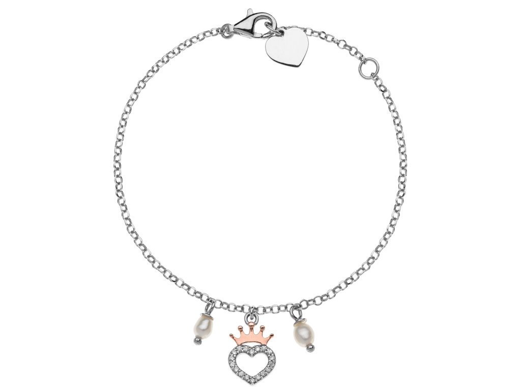 Pozlacený stříbrný dětský náramek s přívěskem ve tvaru srdce a korunky potěší všechny malé milovnice pohádkového světa Disney Princess. Čiré krystaly dodávají šperku jemný třpyt a syntetické perly podtrhují jeho elegantní a slavnostní vzhled.