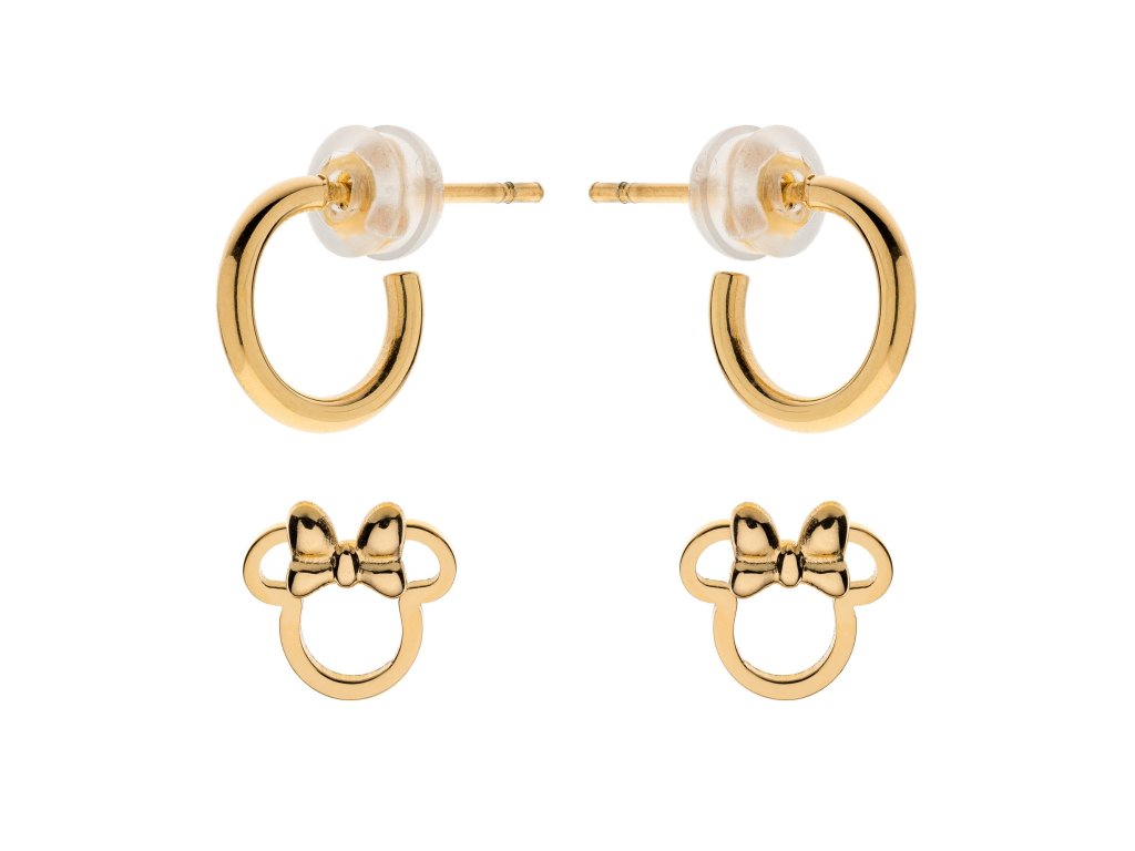 Sada náušnic od Disney obsahuje dva páry náušnic, z nichž jeden pár je ve tvaru obrysu postavičky myšky Minnie Mouse a druhý ve tvaru kruhů. Náušnice jsou vyrobeny z pozlacené nerezové oceli s lesklou povrchovou úpravou, která působí královsky. Oba páry se zapínají puzetkou chráněnou silikonem, která zajišťuje pohodlné nošení a zabraňuje ztrátě náušnic. Dodávány jsou ve stylové krabičce.