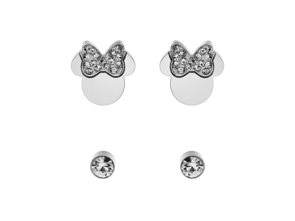 Sada náušnic od Disney obsahuje dva páry náušnic, z nichž jeden pár je ve tvaru hlavy myšky Minnie Mouse a druhý ve tvaru pecek. Náušnice jsou vyrobeny z nerezové oceli s lesklou povrchovou úpravou. Mašle myšky Minnie je zdobena čirými krystaly a do každé pecky je zasazen jeden čirý krystal, který těmto drobným náušnicím dominuje. Oba páry se zapínají puzetkou, která zajišťuje pohodlné nošení a zabraňuje ztrátě náušnic. Dodávány jsou ve stylové krabičce.
