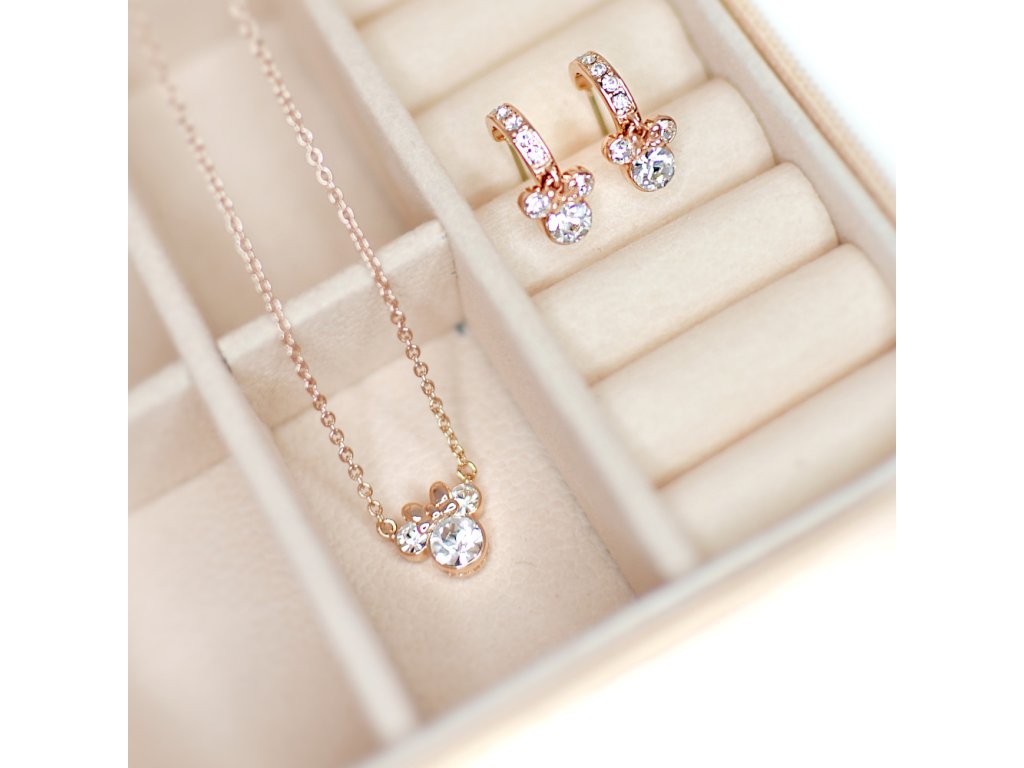 Dárkový set od Disney je vysněným šperkem pro každou milovnici Minnie Mouse. Set se skládá z řetízkového náhrdelníku s přívěskem Minnie a kruhových náušnic s ikonickou siluetou myšky s mašlí. Přívěsek i náušnice jsou osazeny kubickou zirkonií, což šperkům dodává luxusní vzhled.