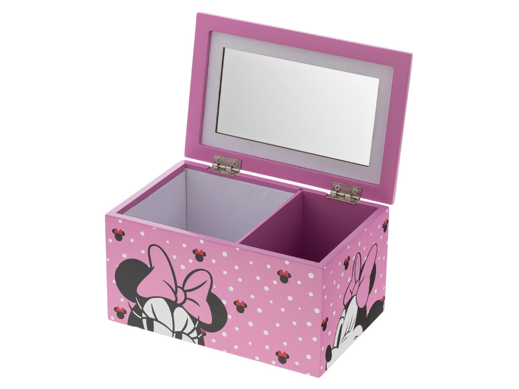 Náušnice, přívěsky, prstýnky a další klenoty, to vše si může bezpečně a stylově uschovat malá slečna do této roztomilé šperkovnice s obrázky Minnie Mouse od Disney.