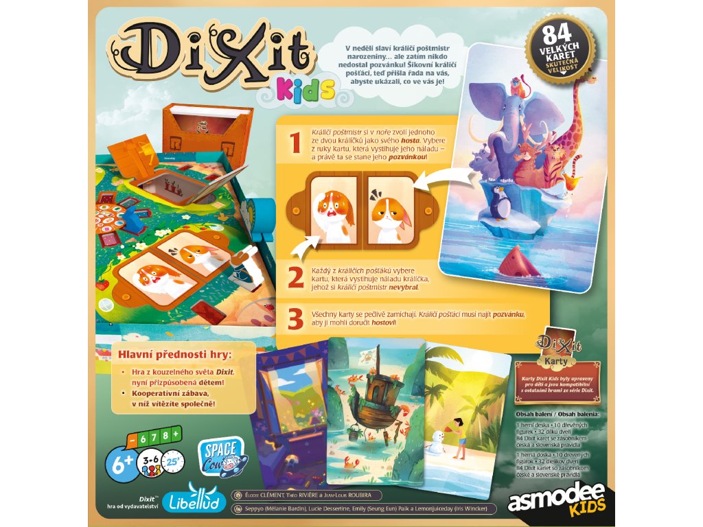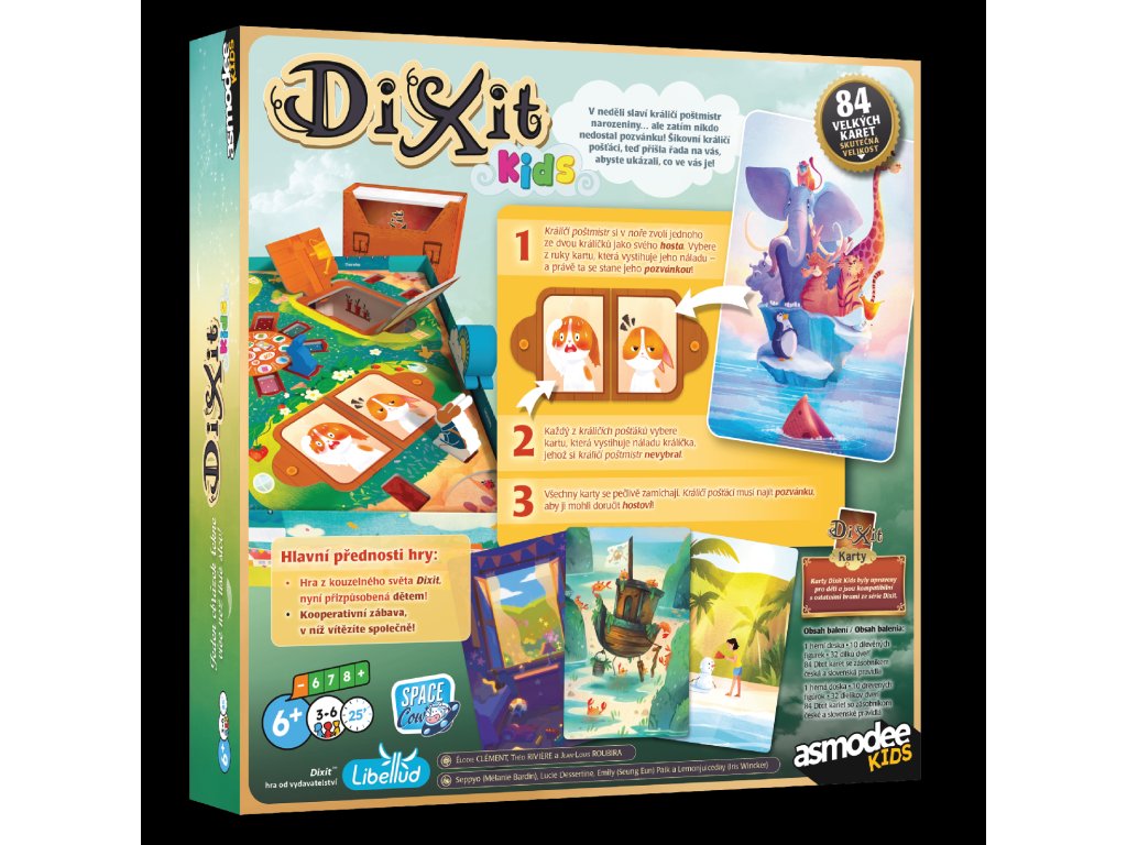 Dixit Kids je dětská verze oblíbené hry Dixit, navržená speciálně pro malé hráče. Jde o kooperativní hru, ve které nevítězí jednotlivec, ale celý tým společně. Hra klade důraz na fantazii, emoce, vyprávění a společný zážitek bez stresu ze soupeření.