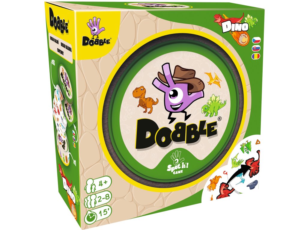 Rychlost, postřeh, reflexy! Dobble Dino, to je 57 různých symbolů, 55 karet, 8 obrázků na kartě a každé dvě karty spolu mají společný jen jeden obrázek! Hra je kompletně v češtině i slovenštině a nabízí zcela unikátní zábavu. Děti zde hledají dva stejné obrázky na kartách při různých verzích hry (v pravidlech je popsáno celkem 5 her). Super jsou kulaté karty i jednoduchá pravidla vysvětlená doslova za pár sekund. Hra je určená především pro děti, ale i jejich rodiče - zkrátka pro všechny, kteří se chtějí pořádně bavit a nemají čas pročítat dlouhá pravidla. Plechová krabička zaručuje bezpečí karet a jednoduše umožňuje mít hru vždy u sebe. Vyzkoušejte i Vy postřehový fenomén Dobble a jistě budete překvapeni, jak i tak jednoduchá hra může být zábavná! Obsah balení: 55 karet v plechové krabičce 1 česká, slovenská a rumunská pravidlaDoplňkové parametry