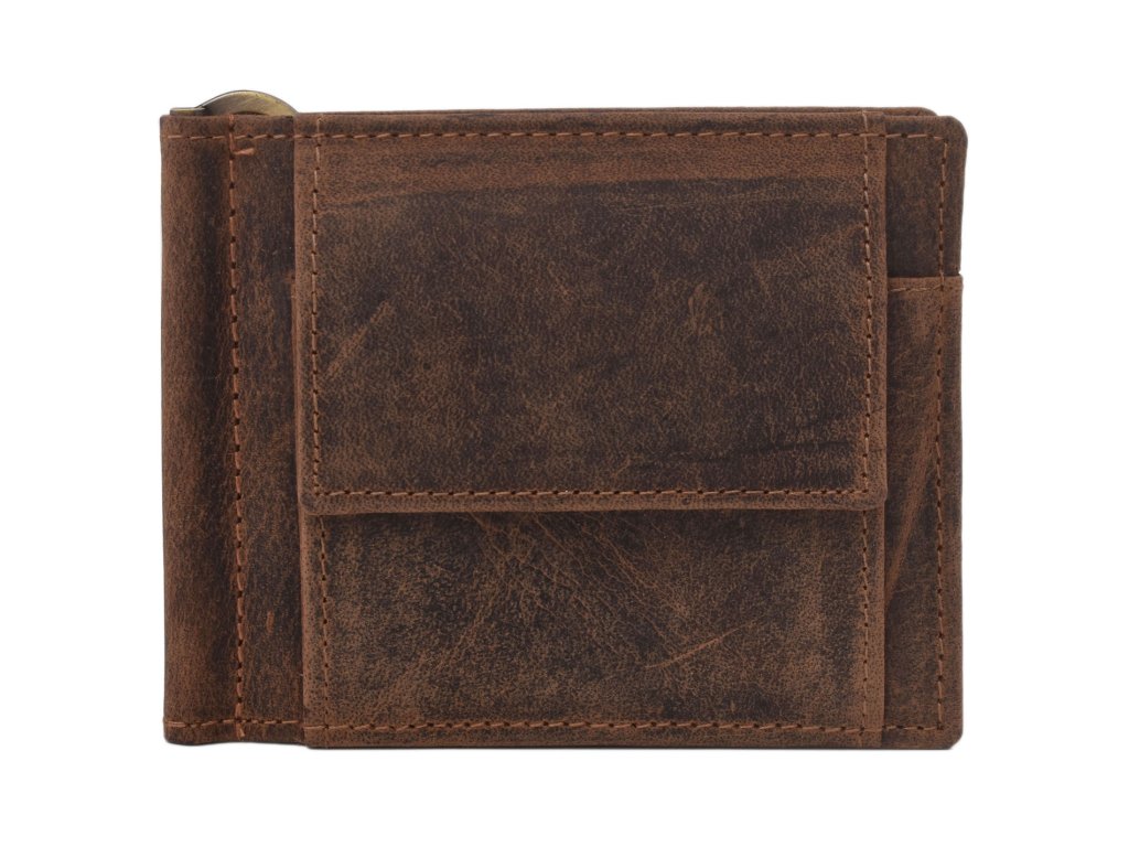 Pánská kožená dolárovka s praktickou sponou uvnitř. Dolárovky jsou šikovné malé peněženky pro muže, kteří nenosí hodně drobných. Tato dolárovka má pouze malý mincovník na přední straně a 4 přihrádky na ty nejdůležitější karty. Tento model má nekontrastní hnědé prošití, které příjemně ladí s přírodní barvou peněženky. Praktická spona dokáže zajistit i bankovky, jako například 1000 nebo 2000 korun a také nemá problém is větším obnosem peněz.