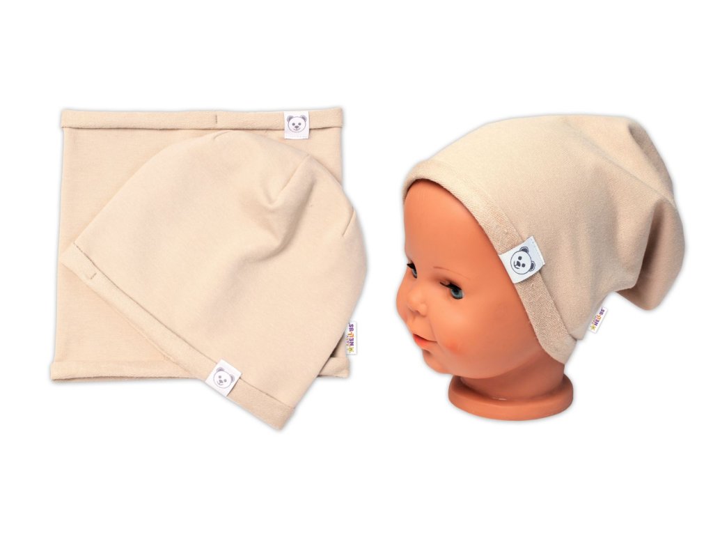 Bavlněná sada čepička a nákrčník Baby Nellys ®. Baby Nellys ® = česká značka - záruka kvality a spokojenosti. Ideální na jarní i letní nošení nebo i podzimní počasí. Čepička je měkkoučká, jemná, dobře se nosí. Materiál: 98% bavlna, 2%elastan. Rozměry: Obvod hlavičky - cca 46-48cm, hloubka 22cm. Obvod hlavičky - cca 48-50cm, hloubka 22cm. Obvod hlavičky - cca 50-52cm, hloubka 22cm. Nákrčník výška cca 22cm, délka (obvod cca 46cm)Doplňkové parametry