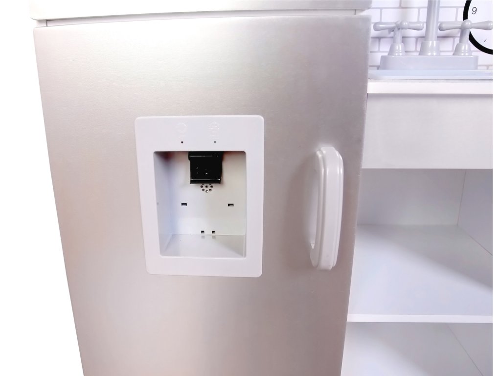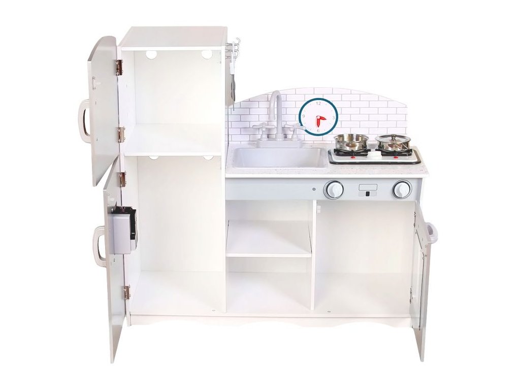 Dřevěná kuchyňka ECO TOYS s vybavením . Velká dětská dřevěná kuchyňka je určená pro všechny malé kuchařky a kuchtíky. Kuchyňka je vyrobená z kvalitního dřeva, v moderním designu, bez ostrých hran. Knoflíky trouby a varné desky jsou otočné, vydávají zvukové efekty. Dveře skřínek jsou vybaveny systémem bezpečného zavírání - zavírají se na magnet. Součástí kuchyňky je také dřez s kohoutky na teplou a studenou vodu,lednička, poličky, skřínky, háčky na zavěšení. Doplňky: hrnce s pokličkou, pomůcky na míchání - vše vyrobeno z hliníku. Během hry dítě rozvíjí svou fantazii, učí se napodobováním běžných činností, zdokonaluje se v manipulaci s předměty. Rozměry: výška - 86 cm šířka - 92 cm hloubka - 30 cm Materiál: dřevo. Vhodné pro děti od 3 let.Doplňkové parametry
