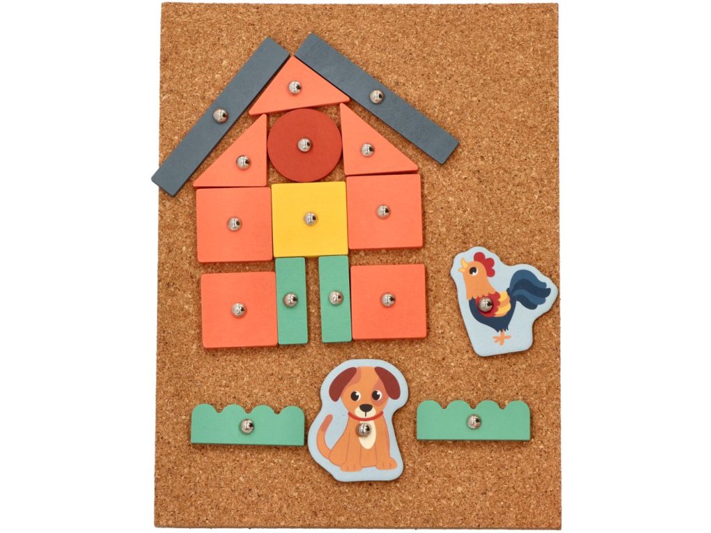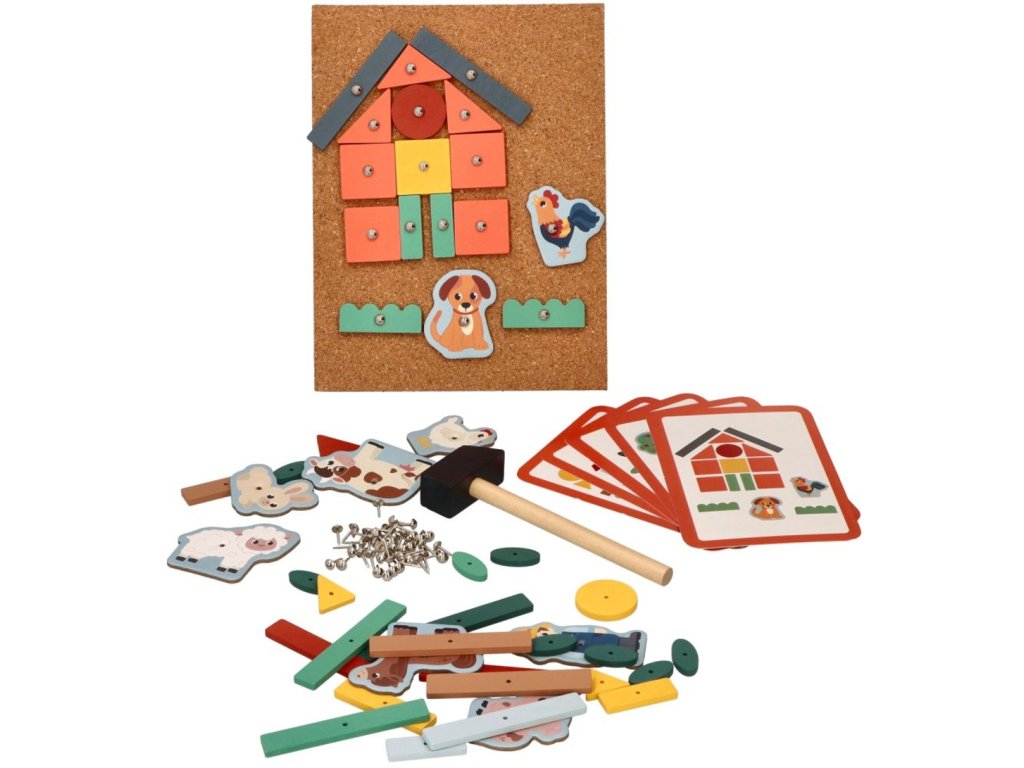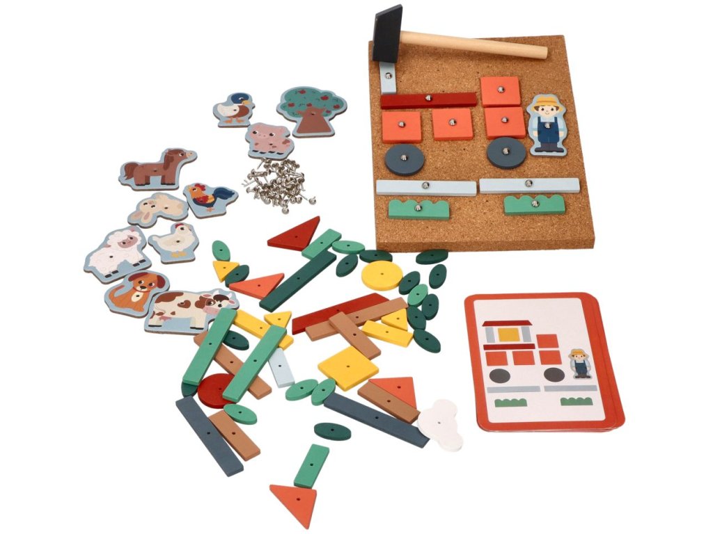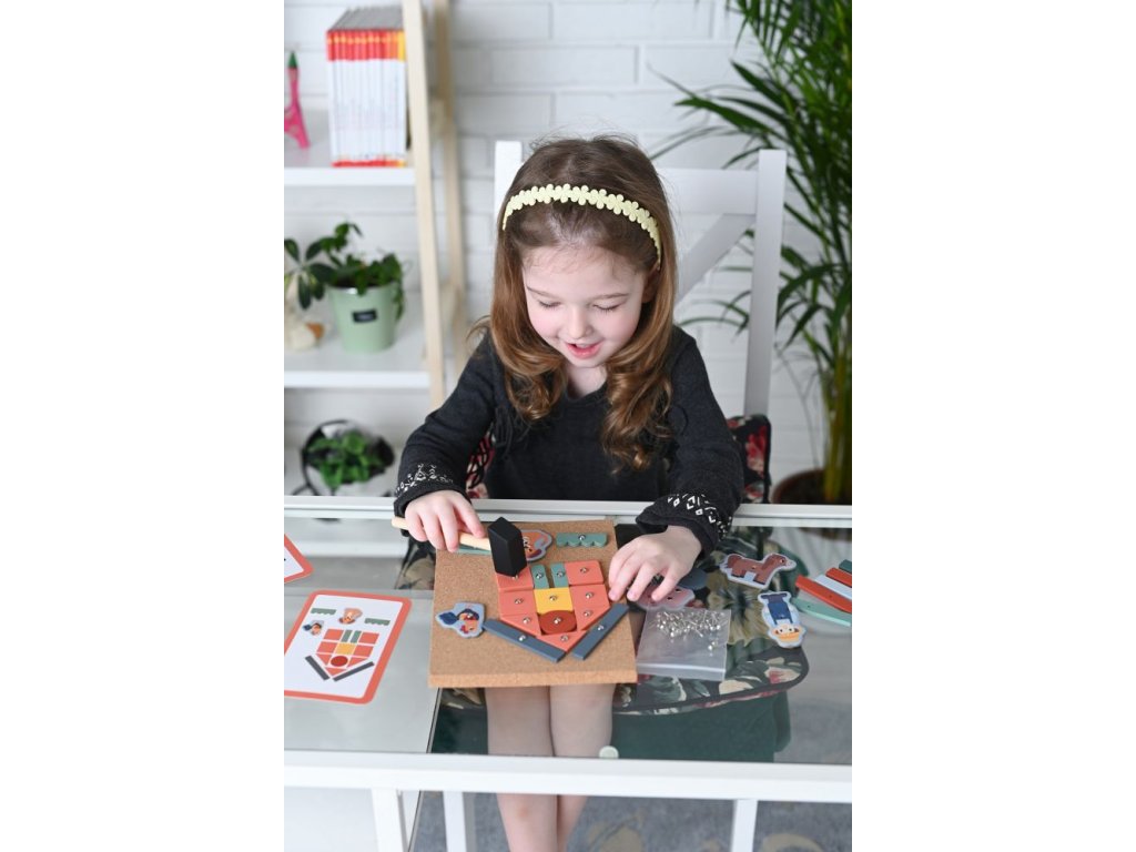 Zajímavý hlavolam procvičující manuální zručnost a zručnost prstů. Magická zábava s kladivem a připínáčky. V balení najdete korkovou desku, kladivo, připínáčky a dřevěné objekty různých tvarů. Děti si mohou na desce díky zatloukačce vytvořit různé obrázky. V balení najdete také obrázkové předlohy, z kterých se děti mohou inspirovat. Rozměry:Rozměry tabulky: 16 x 21 cm Rozměry kladivka: 14x4 cm 76 prvků. Věk: +3.Doplňkové parametry