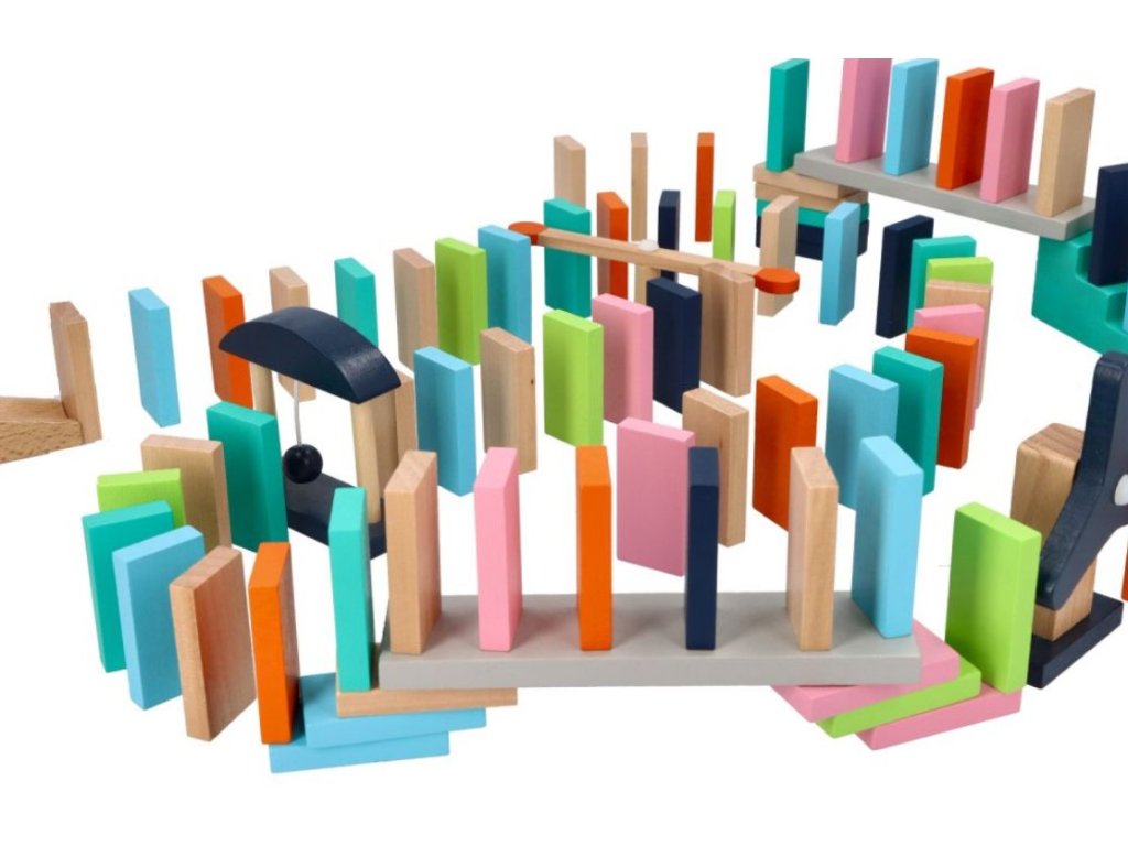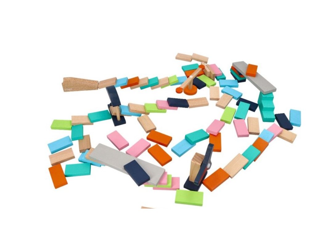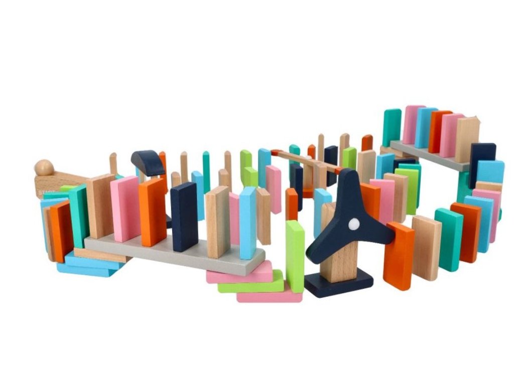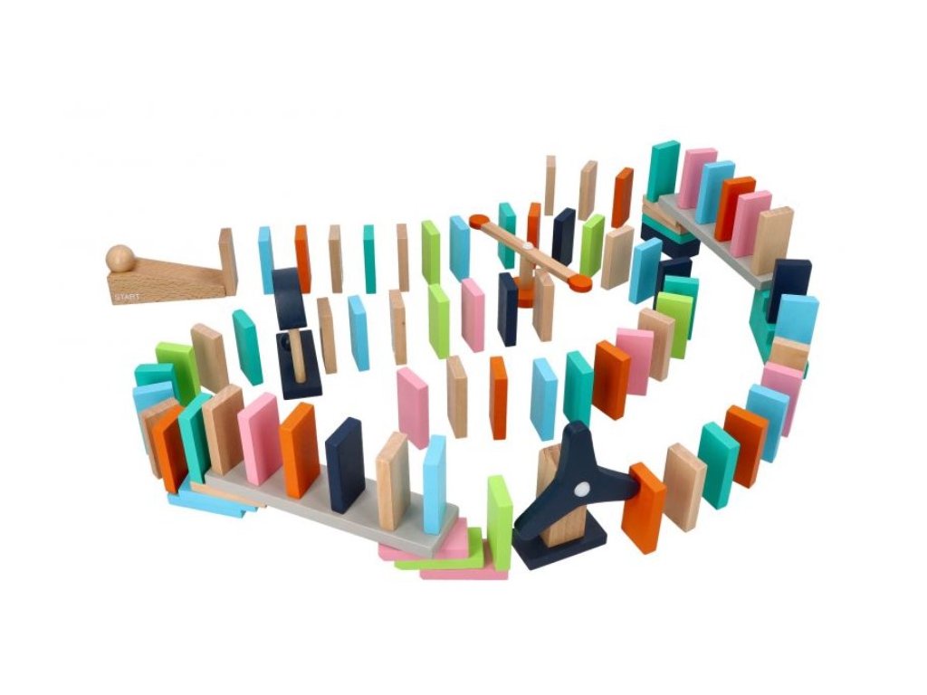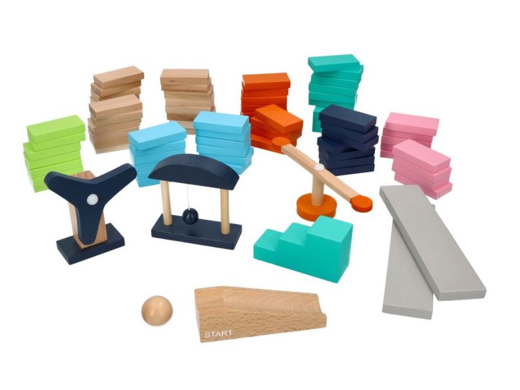 Sada obsahuje dřevěné kostky, díky kterým můžete aranžovat různé kombinace, díky čemuž se hračka příliš rychle neomrzí. Váš vyklápěcí pruh může vypadat pokaždé jinak. Dalším zpestřením jsou prvky jako otočný kolotoč, větrný mlýn, schůdky nebo kulová brána. Nyní stačí nastavit startovací skluz, přitlačit míček a zábava může začít. Díky tomu bude mít vaše dráha kromě originálního tvaru i unikátní prvky, které v jiných sadách nenajdete :) Barevné domino, solidně vyrobené, s důrazem na detail vyrobené z vysoce kvalitního dřeva, se skládá z následujících prvků (celkem 128). - 120 dřevěných kostek v šesti barvách, - 3 jedinečné prvky pro zpestření vaší dráhy: větrný mlýn, kolotoč a kuličková brána, - 2 dlouhé talíře, které lze použít např. jako plošinu , - 3-krokové dřevěné schůdky, - dřevěná skluzavka, která je zároveň startovacím prvkem , - dřevěná koule, která odstartuje celou show padajícího Domina. Věk: 3+ Rozměry balení: 24,5 x 22 x 13,5 cm. Rozměry kostky Domino: 5,3 x 2,7 x 0,8 cm . CE prohlášení o shodě.Doplňkové parametry