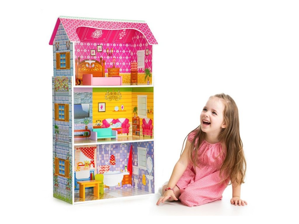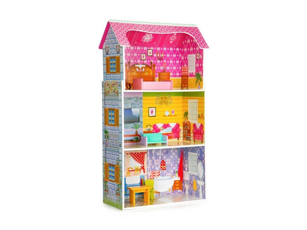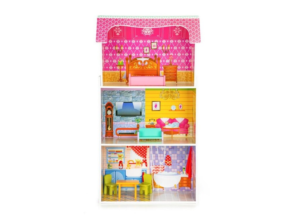Celý domeček je vyroben z vysoce kvalitního dřeva, které neobsahuje žádné ostré a nebezpečné hrany. V první úrovni je koupelna a kuchyň se dvěma židlemi a stolem. Celé druhé patro je prostorný obývací pokoj pro kreativní využití. V horním patře jsou ložnice s postelí. Výbava domečku: Stůl + 2 židle, postel, gauč. Rozměry domku: výška: 95 cm, šířka: 50 cm, délka: 24 cm. 1. jakost. Domeček je vhodný pro děti starší 3 let.Doplňkové parametry
