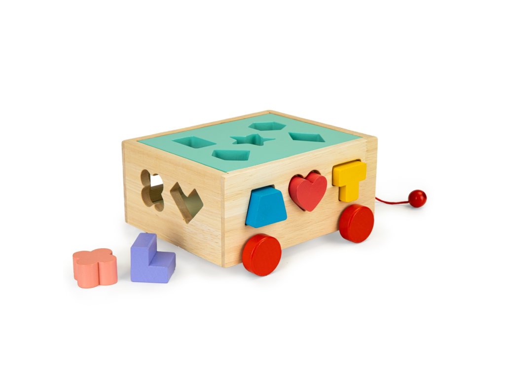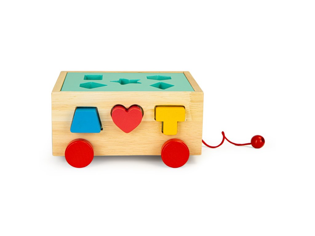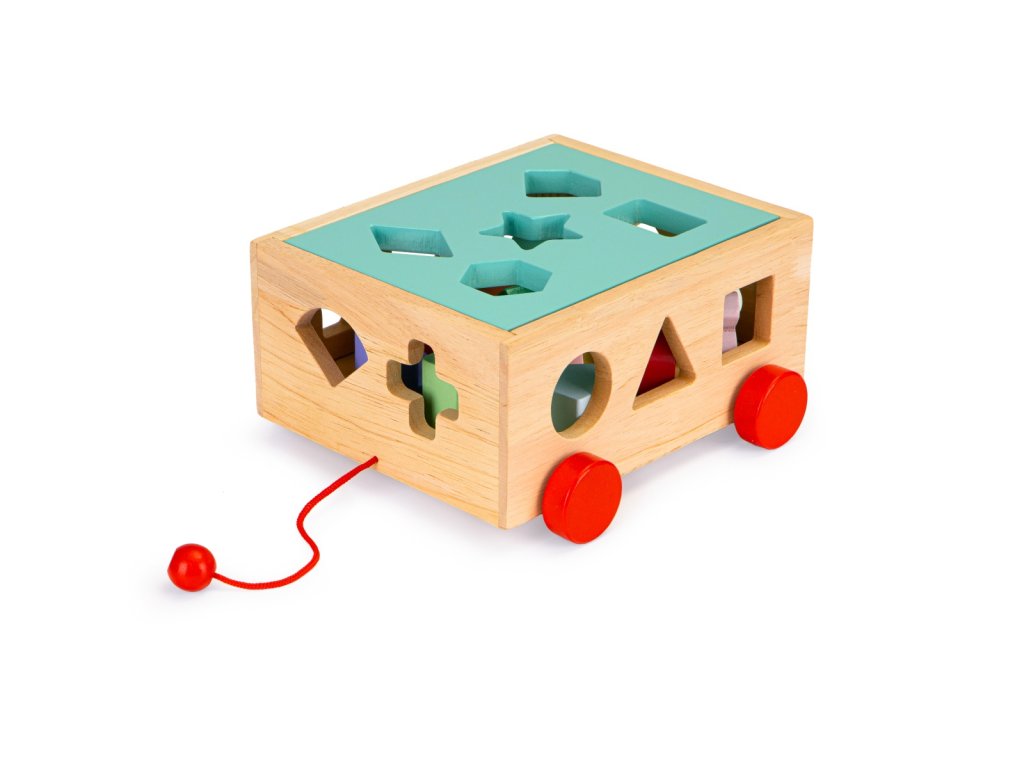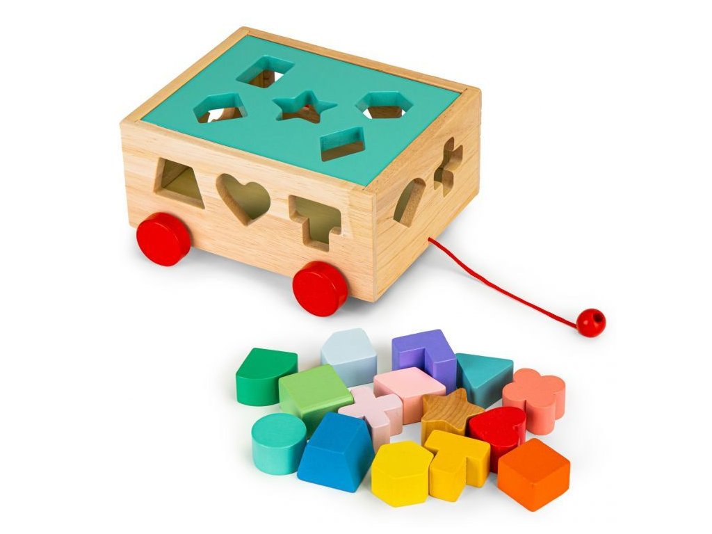 Dřevěný vozík se sortérem na tvary a kostkami – vzdělávací kostka pro děti