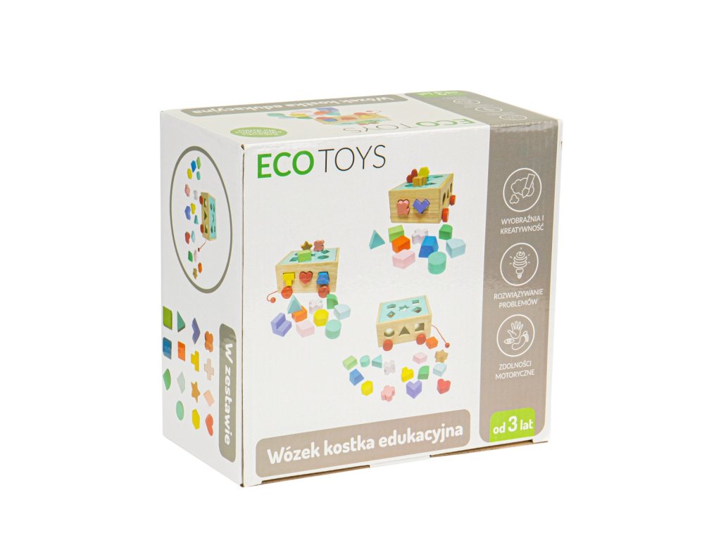 Vozík s třídičem a kostkami. Pro děti od 3 let. Dřevěná a bezpečná konstrukce pro děti. 15 barevných kostek v balení. Sorter tvarů pro chytré učení. Šňůrka pro tahání vozíku. Hračka rozvíjí jemnou motoriku a koordinaci. Produkt značky ECOTOYS. Učení hrou. Hračka má ve stěnách speciální otvory, do kterých může dítě vkládat správné tvary. Díky tomu poznává různé tvary a učí se rozlišovat základní barvy. Bezpečnost na prvním místě. S ohledem na děti jsou naše produkty bez ostrých hran a nebezpečných prvků. Barva použitá na hračce je nezávadná pro zdraví dítěte. Vozík. Díky odnímatelnému víku si může malý objevitel schovat dovnitř své poklady, menší hračky nebo oblíbeného plyšáka a vzít je s sebou na procházku. Hračka zároveň slouží jako praktický úložný prostor na další předměty a učí dítě vracet věci na své místo po skončení hry. Specifikace. Věková skupina: 3+. V balení: vozík a 15 kostek. Hmotnost: 1 kg. Rozměry: 20,5 × 19,5 × 11 cm. Rozměry balení: 20,5 × 21 × 12 cm. Značka: ECOTOYS. Upozornění: Nevhodné pro děti mladší 3 let z důvodu malých částí, které mohou být spolknuty. Obal není hračka, odstraňte ho z dosahu dítěte. Nenechávejte dítě bez dozoru. Dodržujte pokyny výrobce.Doplňkové parametry