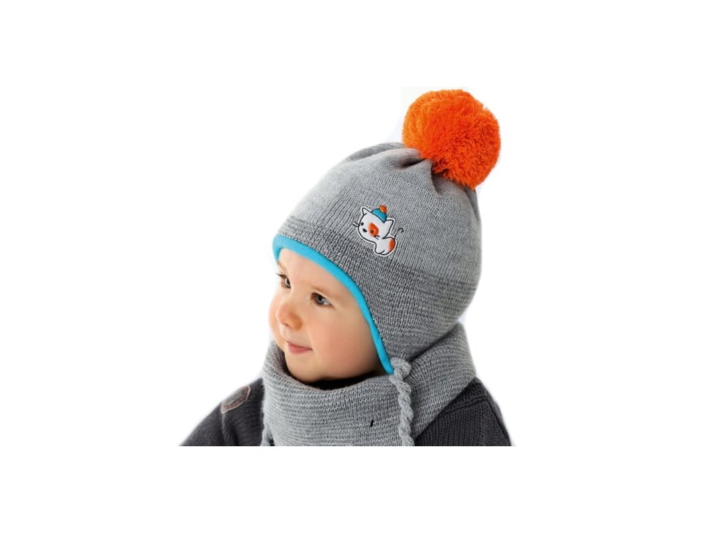Dvouvrstvá pletená čepice s bambulí na zavazování + šátek Kočička, šedá, 40-42cm
