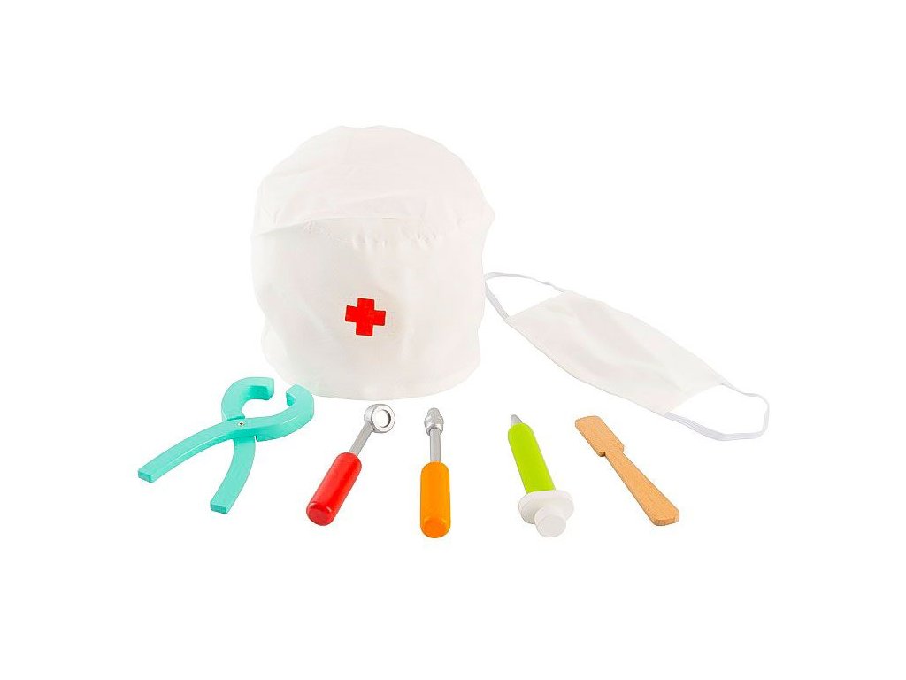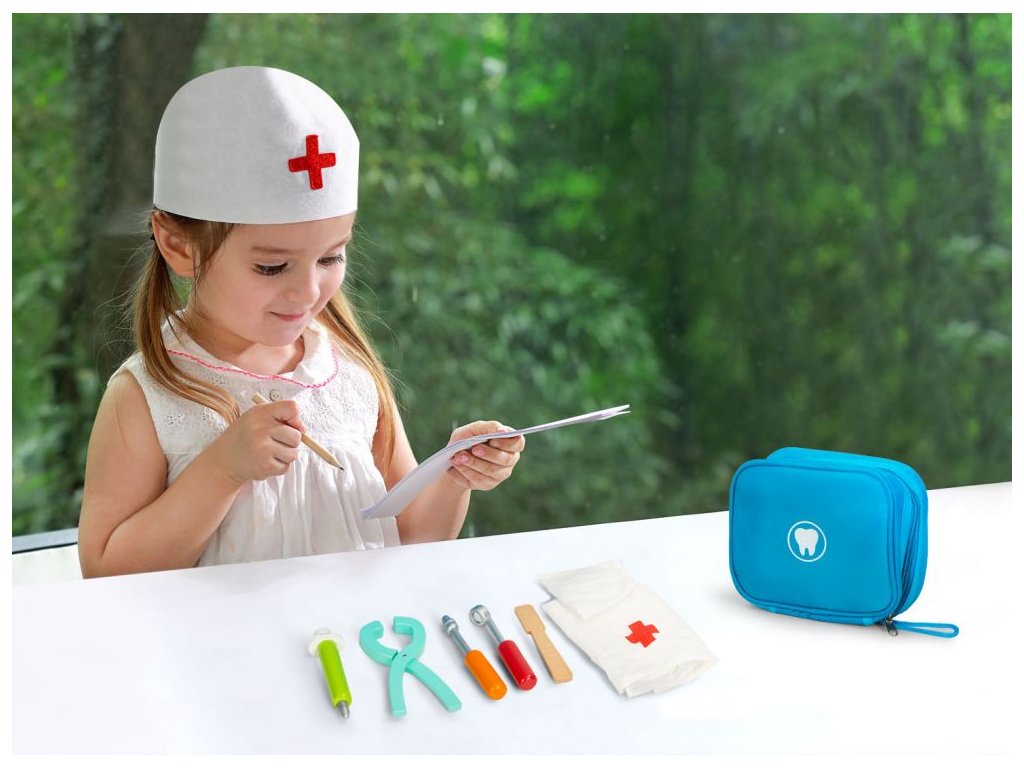 Zubařská sada. Okouzlující sada dřevěných rekvizit, díky nimž si bude moci dítě hrát na roli zubaře a postarat se o zoubky celé rodiny. Sada obsahuje: - čepice, - rouška, - stříkačka - vrtačka, - zubní zrcátko, - kleště, - dlátko, - tašktička na zubní nářadí. Hračka může být skvělý dárek k narozeninám. 1. jakost.Doplňkové parametry