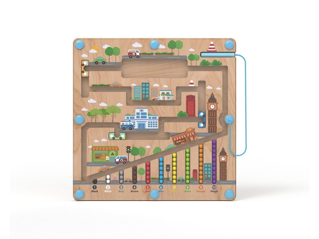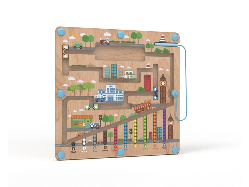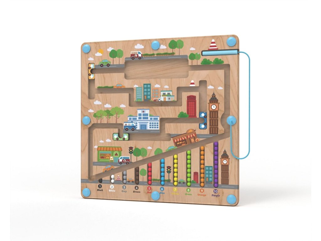 Dřevěný magnetický labyrint – barevné kuličky ve městě Objevte hravou cestu napříč městem, kde děti vedou barevné kuličky bezpečnými uličkami pomocí magnetického ukazovátka. Hra podporuje soustředění, trpělivost a koordinaci rukou a zraku při přesném vedení kuliček. Děti mohou přiřazovat kuličky podle barvy, pojmenovávat objekty ve městě a učit se jednoduché počty – vše formou hry, která je přirozená a zábavná. Robustní dřevěná základna ve tvaru města je uzavřena odolnou průhlednou deskou, díky čemuž je hračka bezpečná a vhodná i pro menší děti. Magnetický princip zajišťuje čisté hraní bez volných dílků, rozvíjí jemnou motoriku, logické myšlení i první poznávání barev a prostoru. Skvělá volba pro děti, které objevují svět kolem sebe. Důležité informace Vhodné pro děti od doporučeného věku výrobce. Používejte pod dohledem dospělé osoby. Obal není hračka – odstraňte jej z dosahu dětí. Výrobek obsahuje magnet – uchovávejte jej mimo dosah malých dětí při riziku spolknutí nebo poškození hračky.Doplňkové parametry