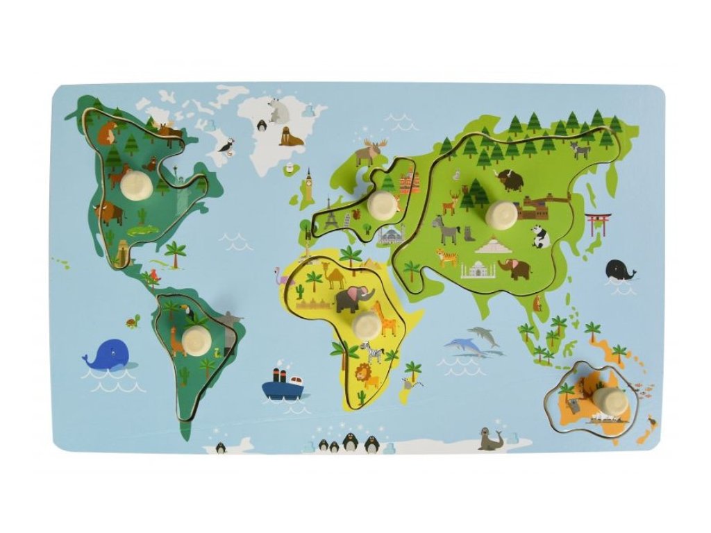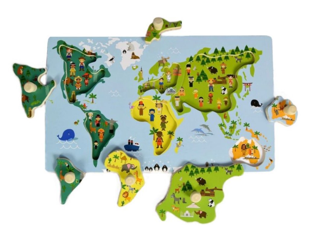 Edukační vkládačka/puzzle s úchyty. Krásné puzzle Adam Toys je ideální hračka k procvičování dovedností a na druhé straně skvělou zábavou k prozkoumávání. Hračky tohoto typu rozvíjejí mnoho dovedností: - díky úchytům dítě cvičí uchopovací schopnosti, - rozvíjí koordinaci rukou a očí tím, že musí dílek vložit ná správné místo, - rozvíjí vnímavost a logické myšlení, když potřebujete kombinovat tvary mezi sebou, - v této hádance se dítě nejen učí o kontinentech a o tom, jak vypadá svět. Po zvednutí bloku uvidíte obyvatele daného kontinentu. Puzzle jsou vyrobené výhradně z přírodního dřeva, lakované prvky jsou pro Vaše dítko bezpečné. Jemné barvy upoutají pozornost. Rozměry:30 x 18 cm. Věk: 1+.Doplňkové parametry