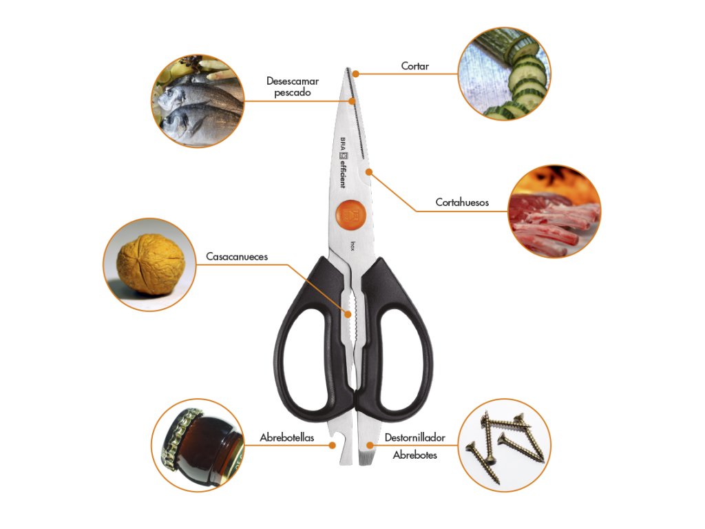 Masivní pevné nůžky do domácnosti umožňují porcování ryb a drůbeže, stříhání bylin nebo zeleniny, louskání ořechů, otevírání lahví, konzerv, ale i klasické použití na papír, provázky či fólie. Vyrobeny z prvotřídní nerezavějící oceli a odolného plastu, komfortní rukojeti s protiskluzovou úpravou pro bezpečné použití. Délka 21 cm.