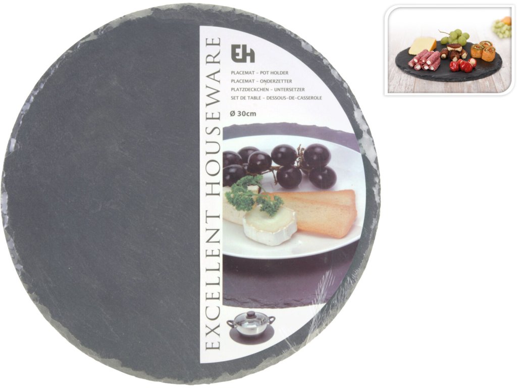 Servírovací podnos o průměru 30 cm je vyrobeny z černé břidlice. Zlomené hrany podtrhují autentický vzhled, gumové nožičky chrání povrchy vašeho nábytku. Díky neobvyklému materiálu je podnos ideální pro jemné sýry a salámy a ovoce. Nejen že skvěle vypadá na stole nebo bufetu, je taky praktický. Břidlice je odolná proti prořezání a neabsorbuje žádné pachy.