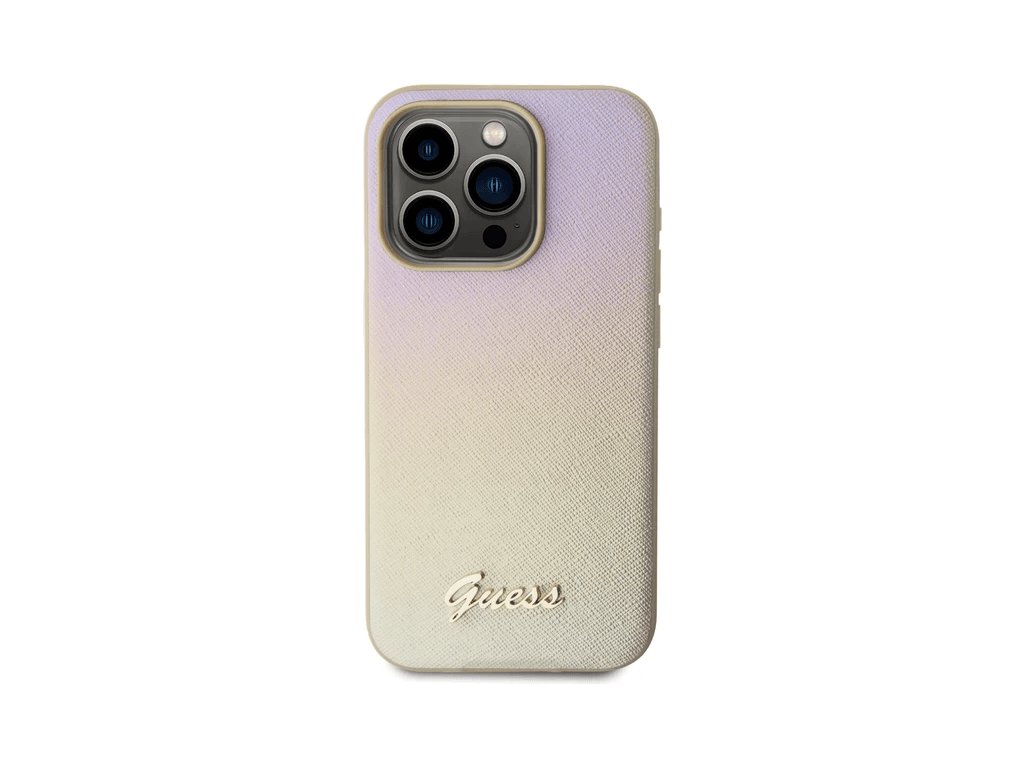 Guess PU Leather Iridescent Metal Script kryt pro iPhone 15 Pro - Zlatá