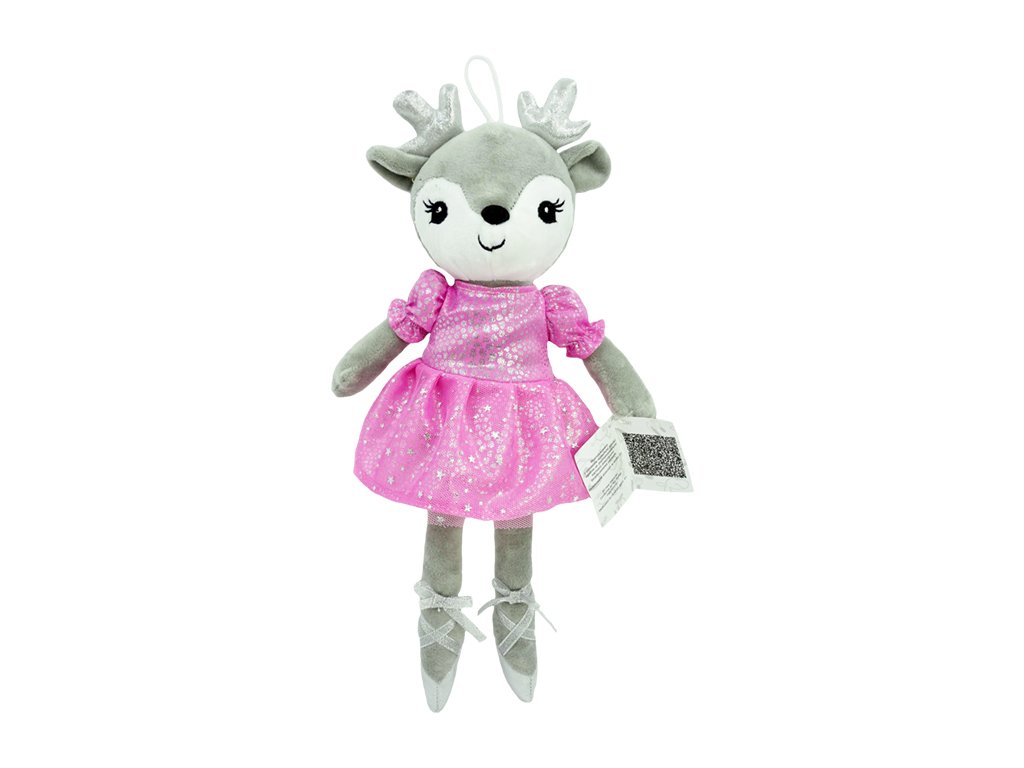 Hadrová panenka – Baletka Jelínek, 35 cm Roztomilá hadrová panenka v podobě jelení baletky se stane oblíbenou hračkou každé malé princezny. Panenka má jemné šedé tělíčko, krásné třpytivé růžové šatičky s hvězdičkami a na nožkách baletní špičky se stužkami. Díky měkkému provedení je ideální na mazlení, hraní, usínání i cestování. Vlastnosti: – příjemný měkký materiál vhodný k mazlení – jemné detaily obličeje, oušek a parůžků – pevně přišitý oděv i botičky – bezpečné pro děti – praktické poutko pro zavěšení – krásný dárek pro malé baletky a milovnice zvířátek Velikost: cca 35 cm. Materiál: polyester (plyš, textil). Vhodné pro děti: od 0+ měsíců. Bezpečnostní upozornění: – Hračka je testována a splňuje normy EU (CE). – Odstraňte veškeré obaly a štítky, než hračku předáte dítěti. – Používejte pod dohledem dospělé osoby. Údržba: Doporučeno ruční praní na 30 °C, nežehlit, nesušit v sušičce.Doplňkové parametry