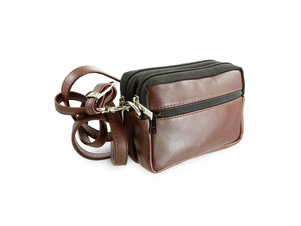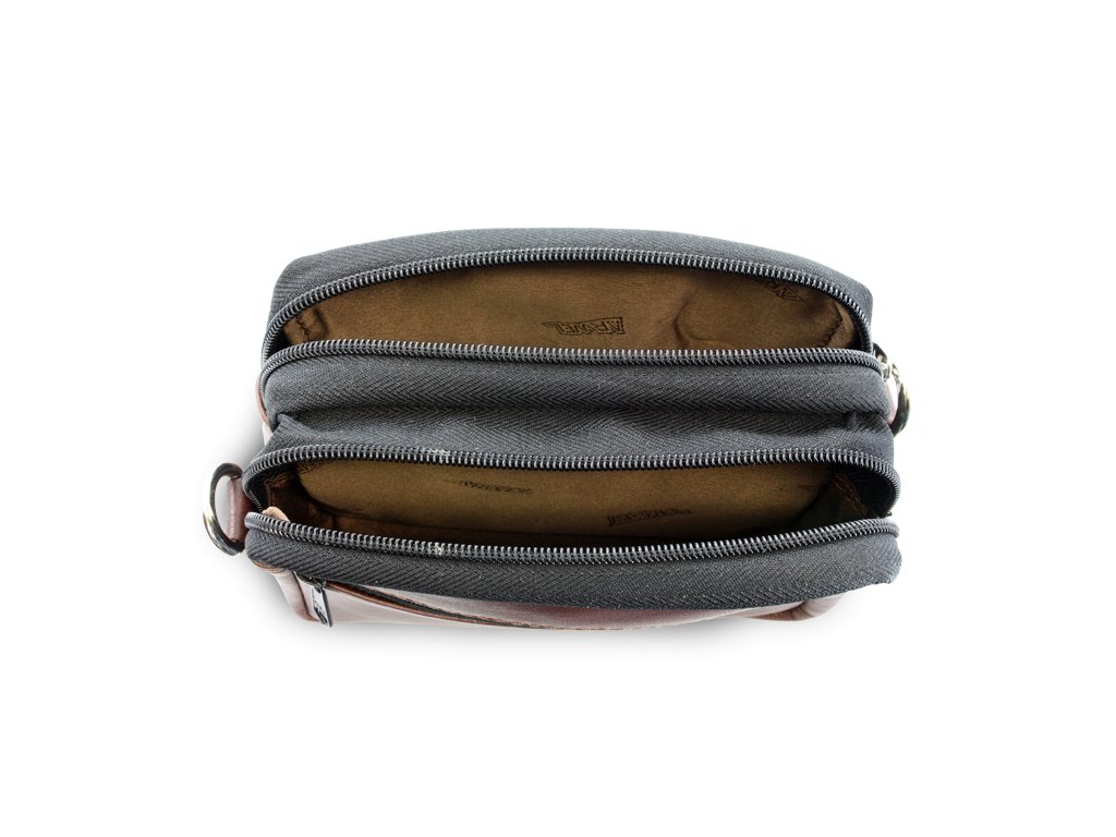 2 velké zipové kapsy a malá přední kapsička, na zadní straně poutko pro opasek, součástí je odepínací a nastavitelný kožený popruh v max délce 140 cm s karabinkami.