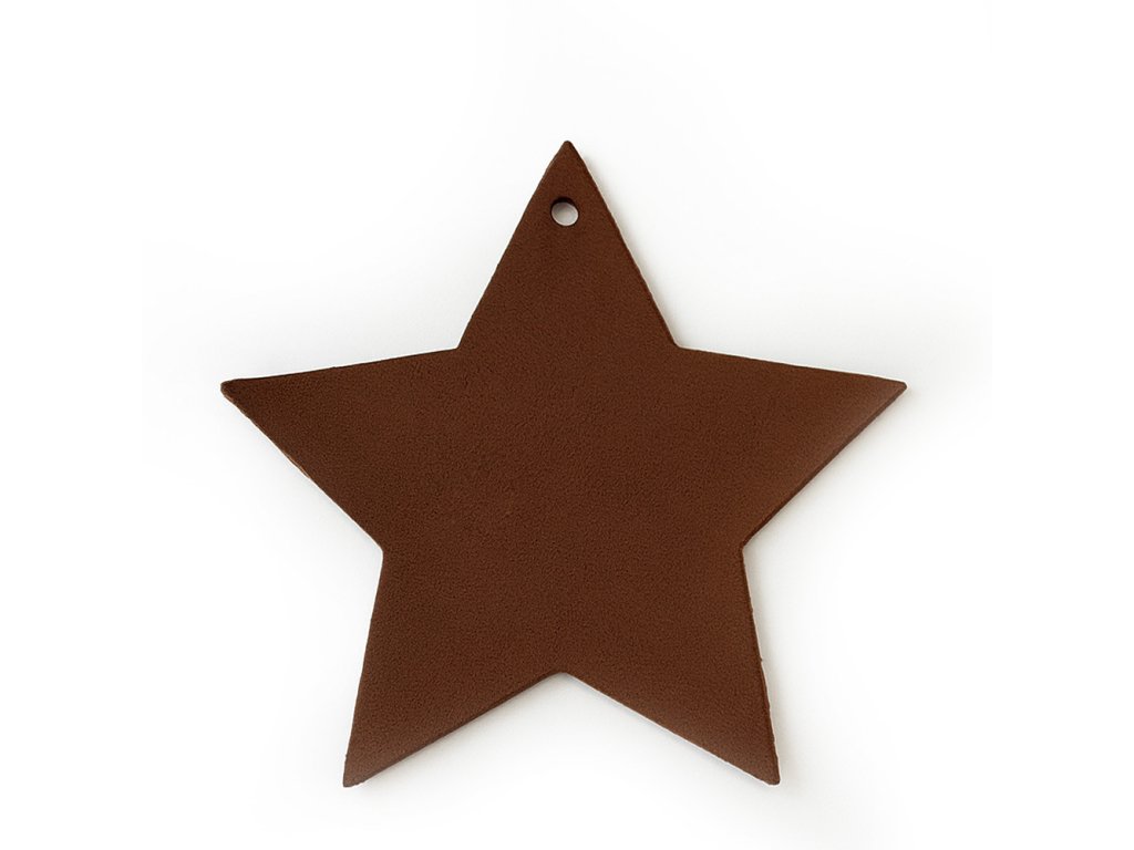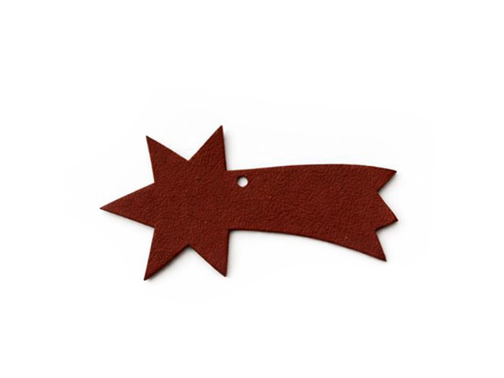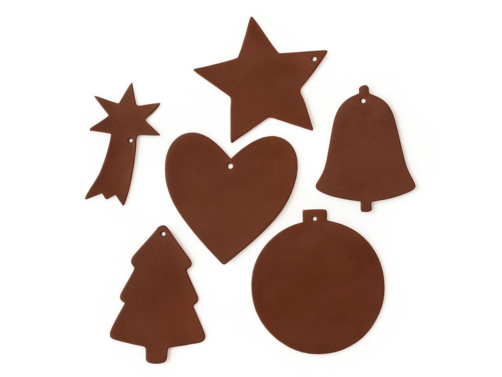 Vánoční sada kožených ozdob na stromeček obsahuje hvězdu, kometu, zvonek, srdce, stromeček a baňku.