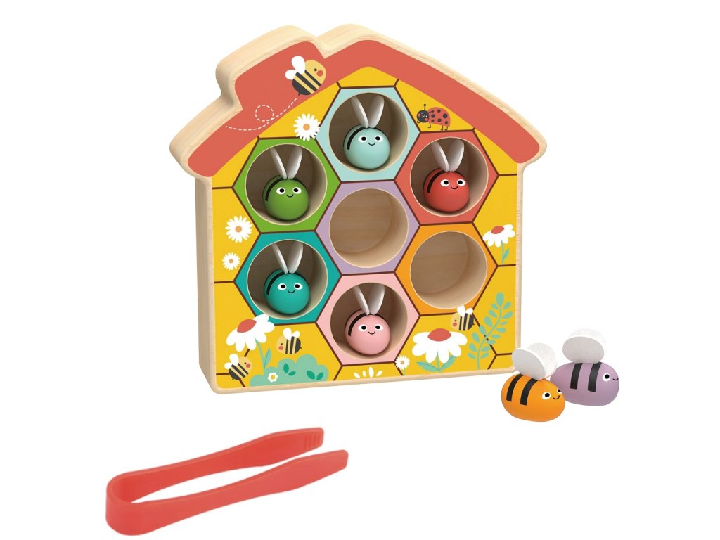 Dřevěná výuková hra s včelkami inspirovaná Montessori Zábavná dřevěná výuková hra inspirovaná Montessori hračkami, která přirozeně rozvíjí dětské dovednosti formou hry. Děti pomocí pinzety vytahují barevné včelky z plástve ve tvaru domečku a opět je vkládají zpět na správné místo. Hra podporuje jemnou motoriku, koordinaci ruka–oko, trpělivost a vizuální vnímání. Učení probíhá zábavnou a nenásilnou formou, která dětem přináší radost a úsměv na tváři. Hlavní vlastnosti Originální plást ve tvaru domečku. 7 pestrobarevných včelek. 1 praktická pinzeta. Rozvoj jemné motoriky a logického myšlení. Inspirace Montessori principy učení. Hračka je vyrobena z kvalitního FSC® certifikovaného dřeva. Certifikát FSC® (Forest Stewardship Council) zaručuje, že použité dřevo pochází z lesů obhospodařovaných šetrným a odpovědným způsobem. Technické informace Rozměry: 16,5 × 4 × 16,5 cm. Materiál: FSC® dřevo. Počet dílů: 9. Doporučený věk: 3+.Doplňkové parametry