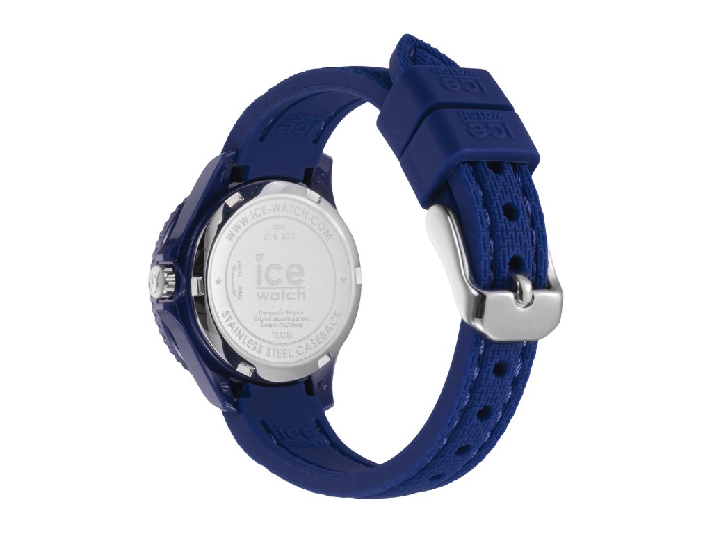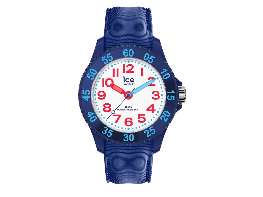 Dětské hodinky Ice Watch s číselníkem v bílé barvě zdobeným červenými arabskými číslicemi a barevnými ručkami s vteřinovou ručičkou, uloženým v modrém pouzdře s indexy pro odečítání vteřin a modrým řemínkem.Doplňkové parametry