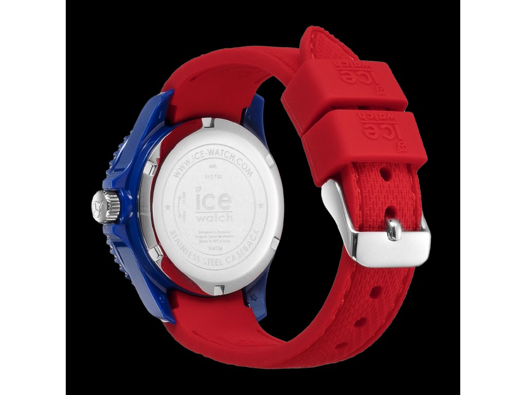 Dětské hodinky Ice Watch s číselníkem v červené barvě zdobeným modrými arabskými číslicemi a bílými ručkami s vteřinovou ručičkou, uloženým v modrém pouzdře s indexy pro odečítání vteřin a červeným řemínkem.Doplňkové parametry