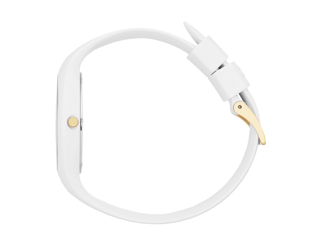 Pouzdro má průměr 40 mm. Pásek je bílý a vyrobený z měkkého silikonu, který je velmi příjemný na nošení a nenáročný na údržbu.