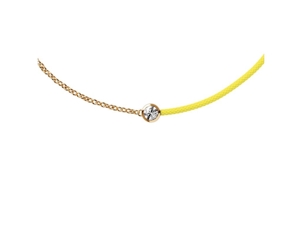 Dvě textury, dvě zářivé barvy a uprostřed třpytivý ekologický diamant z Antverp — svěží, hravý a zároveň subtilní dámský náramek s elegantním detailem.
