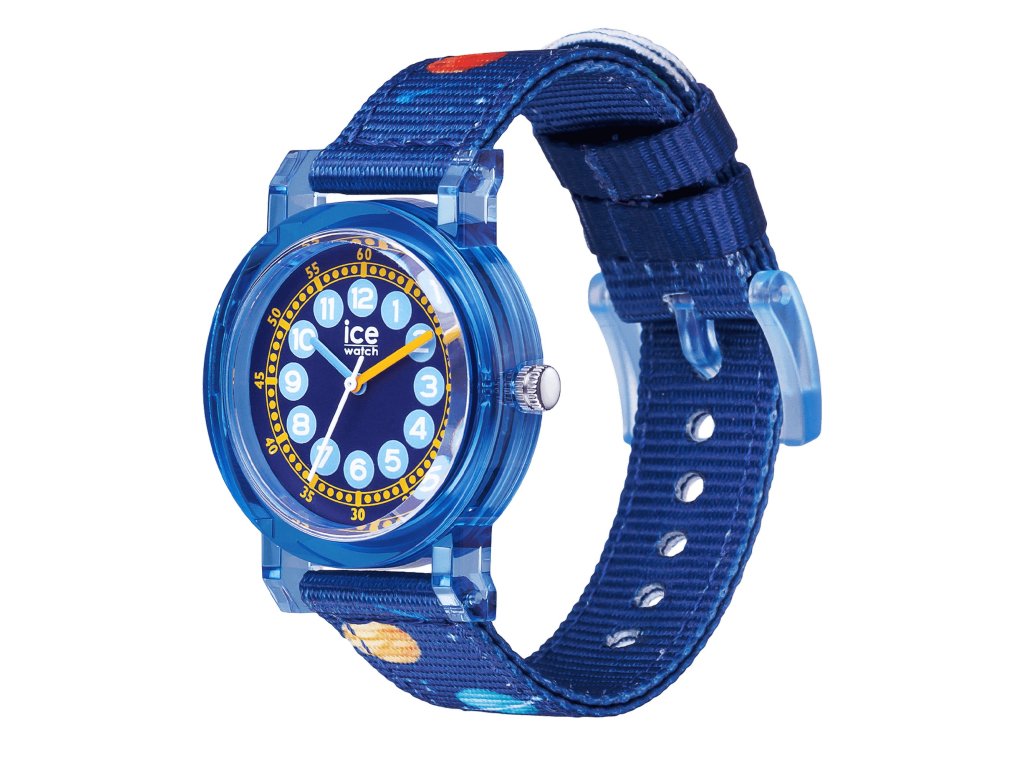 Na číselníku tmavě modré barvy velmi pěkně ve světle modrých kolečkách vynikají bílé číslice a poté logo značky umístěné v horním středu číselníku. Velké číslice umožňují snadnou časovou orientaci, stejně tak jako ručky světle modré, bílé a žluté barvy. Číselník je vsazen do modrého plastového pouzdra velikosti 32 mm, s nímž je spojen nylonový řemínek modré barvy, na němž vynikají různé planety.