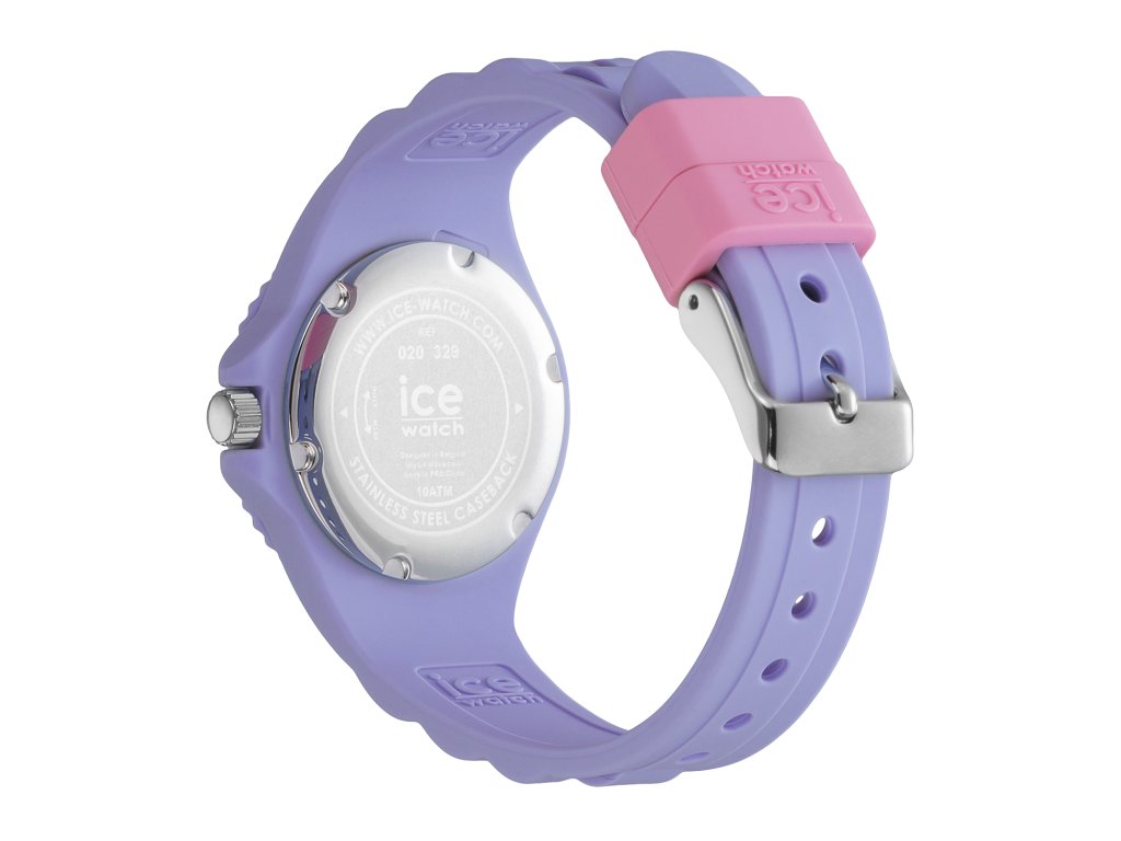 Dětské hodinky Ice Watch s číselníkem v bílé barvě zdobeným růžovým orámováním a fialovými arabskými číslicemi a barevnými ručkami s vteřinovou ručičkou, uloženým ve fialovém pouzdře s indexy pro odečítání vteřin a fialovým řemínkem.Doplňkové parametry