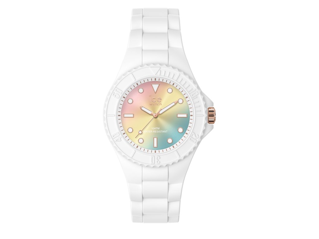Dámské trendy hodinky bílé barvy a číselníkem s aplikací duhy.