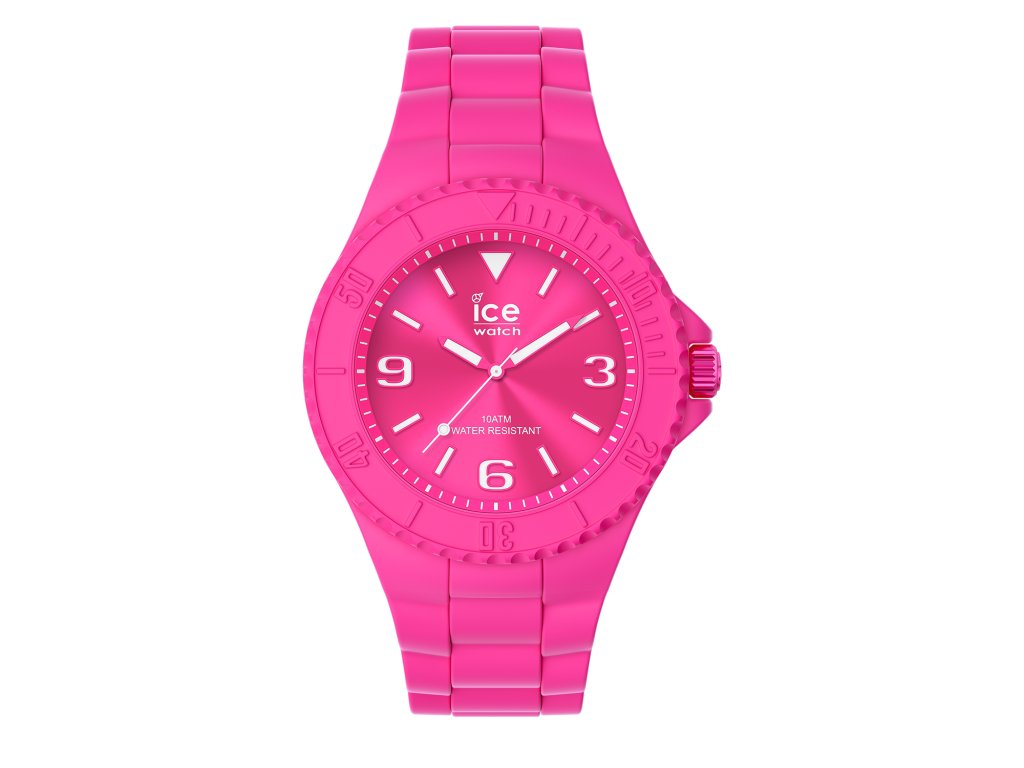 Dámské trendy hodinky růžové barvy s číselníkem, který kombinuje indexy a číslice.